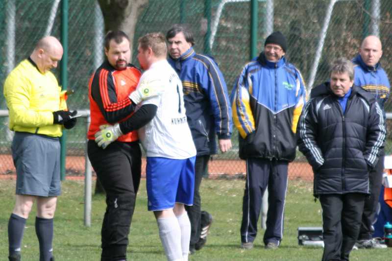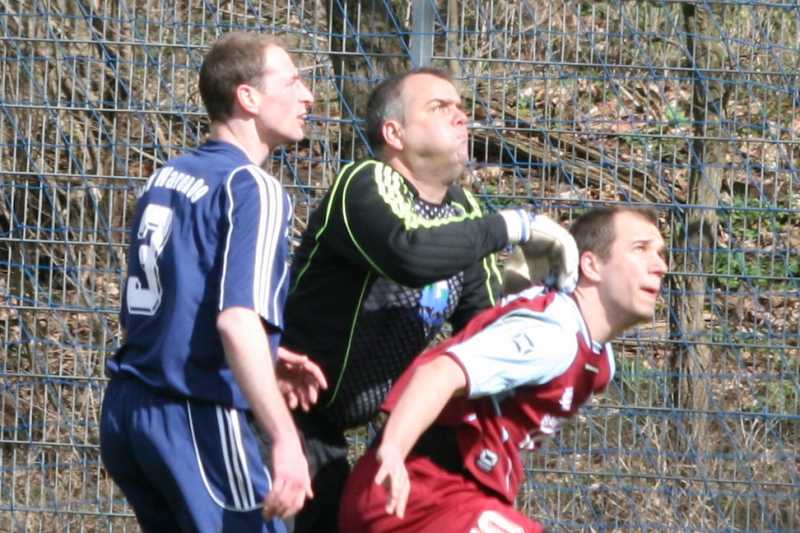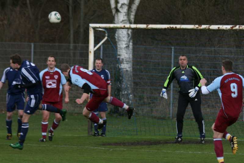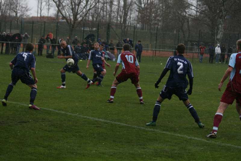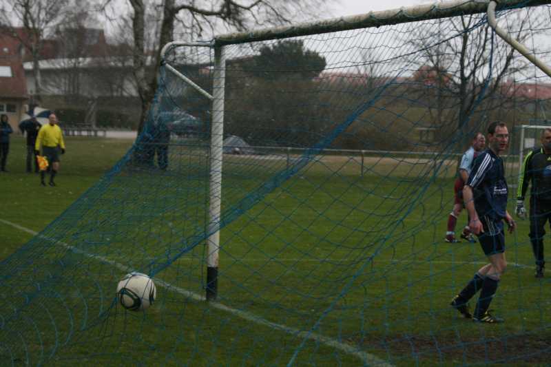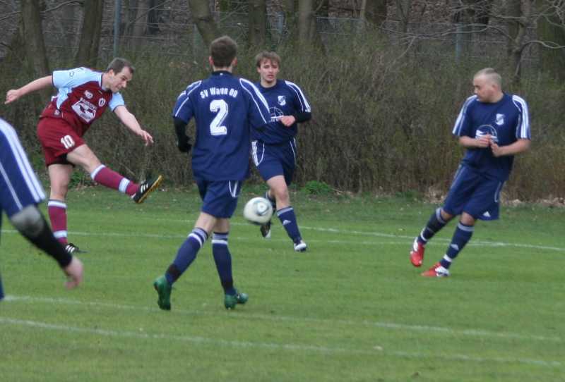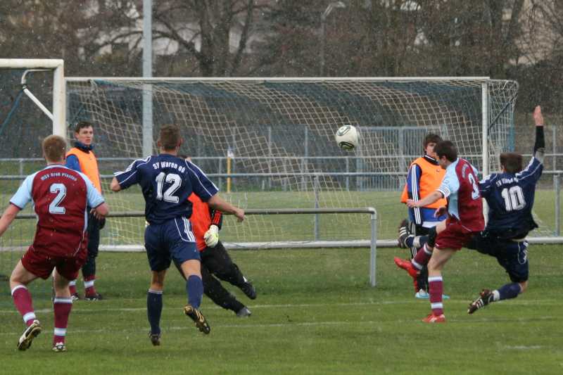 So kann man die nennenswerten Aktionen des Spiels an einer Hand abzählen. In der 32. Minute setzte sich Henning Voß auf der linken Seite durch und schoss aus ca. 14 Metern auf den vom Oldie Thomas Vierow gehüteten Kasten. Der hatte mit dem vor ihm aufprallenden Ball Probleme und konnte nur auf den freistehenden Hannes Bauer abklatschen. Leider traf Hannes Bauer den Ball nicht richtig und schoss völlig freistehend aus 7 Metern neben den Kasten. Im Gegenzug konnte sich auf der linken Warener Seite Marco Krolikowski durchsetzen und flankte auf den zentral freistehenden Daniel Schultze, der keine Mühe hatte zur Warener Führung zu verwandeln(34.).