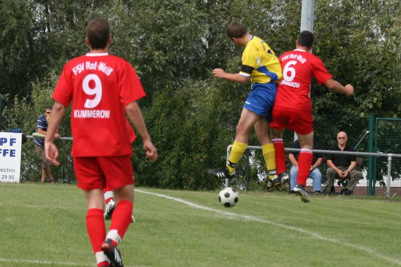 Martin Evert mit einem Schuss aus 20 Metern (7.) und einer guten Kopfballmöglichkeit (12.), René Duggert per Kopf aus fünf Metern (15.) sowie Kay Ruschin nach glänzendem Steilanspiel von Danny Strübing (19.) vergaben allesamt den Führungstreffer. Einen der wenigen gefährlichen Konterangriffe in der ersten Halbzeit schlossen die Kummerower mit einem 20-Meter-Schuss neben den Pfosten ab.