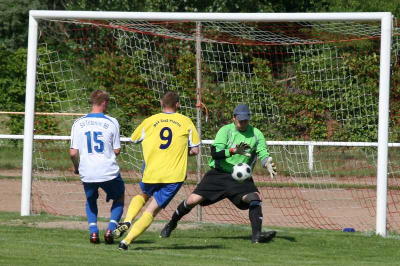In den ersten 20 Minuten hätte man noch auf einen Plastener Erfolg hoffen können. Ein Kopfball von Eric Hödl aus fünf Metern Entfernug strich am langen Pfosten vorbei. Auf der anderen Seite verzog Maag am Fünfereck mit einem völlig verkorksten Schuss. Manuel Berndt tauchte zwei mal gefährlich im Teterower Strafraum auf. Einmal übersah er den besser postierten Eric Hödl und beim nächsten Mal drückte Schiri Erdmann beide Augen zu, um nicht auf Elfmeter für Plasten entscheiden zu müssen. Das gleiche Prozedere wiederholte sich in der 19. Minute als Jan Ullrich im Strafraum von den Beinen geholt wurde und wieder kein Elfmeter für Plasten gegeben wurde. Im Gegenzug hätte es dann aber durchaus einen Strafstoß für Teterow geben können. Andreas Heinzel kam einen Tick zu spät und ließ den Teterower Stürmer im eigenen Strafraum über die Klinge springen(21.). Eine Minute später zog der heute gut aufgelegte Florian Gutsch aus 16 Metern volley ab und zwang Groth im Teterower Kasten zu einer Glanztat.