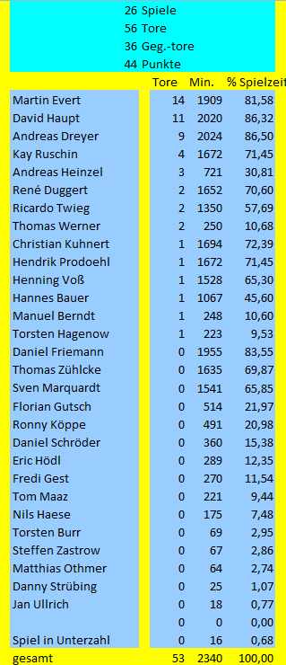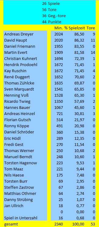 Vier Spieler kommen auf über 80% Einsatzzeit. Die 90%-Marke konnte in diesem Jahr nicht geknackt werden. Auf die größte Einsatzzeit kann Andreas Dreyer(86,5%) verweisen, gefolgt von David Haupt(86,32%), Daniel Friemann(83,55%) und Martin Evert(81,58%). Bemerkenswert ist auch die Tatsache, dass nur 16 Minuten (auswärts gegen Röbel) in Unterzahl gespielt werden musste.