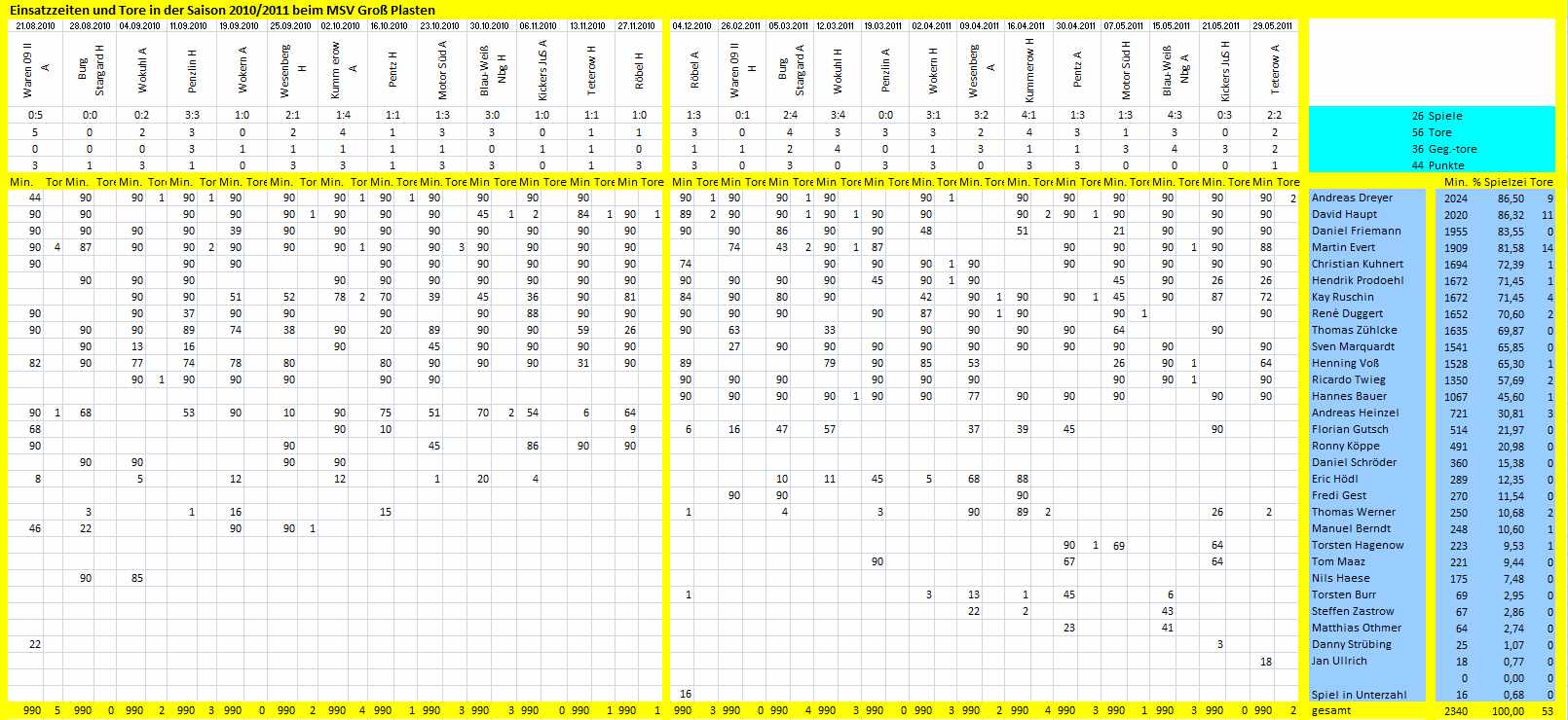 Die meisten Tore erzielten Martin Evert(14), David Haupt(11) und Andreas Dreyer(9). Kay Ruschin folgt mit größerem Abstand(4). Drei Tore wurden am grünen Tisch erzielt, durch das Urteil des Schiedsgerichtes im Spiel Penzliner SV gegen den MSV (0:3). |