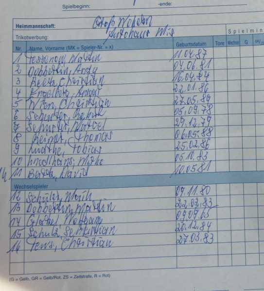 Wokern: Tessenow, Andy Dobbertin, Reetz, Engelberg, Wien, Robert Schuster (75. rot), Marcel Schuster (36. Glatzel, 70. Schulz), Reimer (22. Martin Dobbertin), Lüdtke, Knodlhans, Bartz (bitte in der Bildergalerie nachschauen, ob die Namen richtig entziffert wurden)