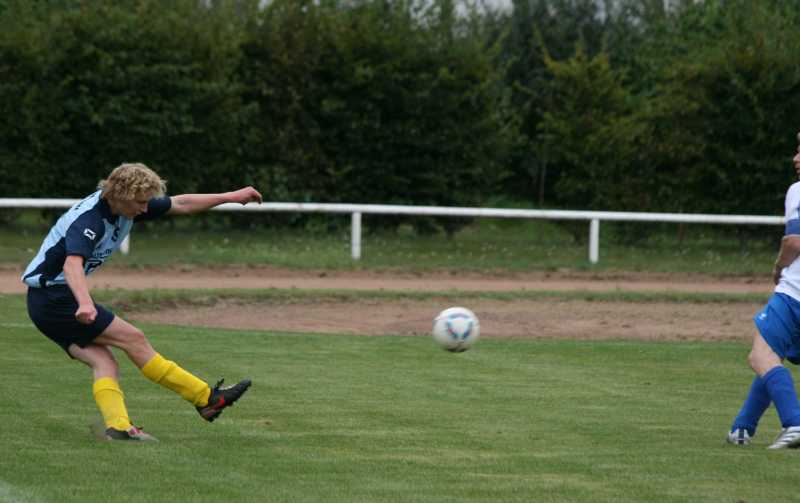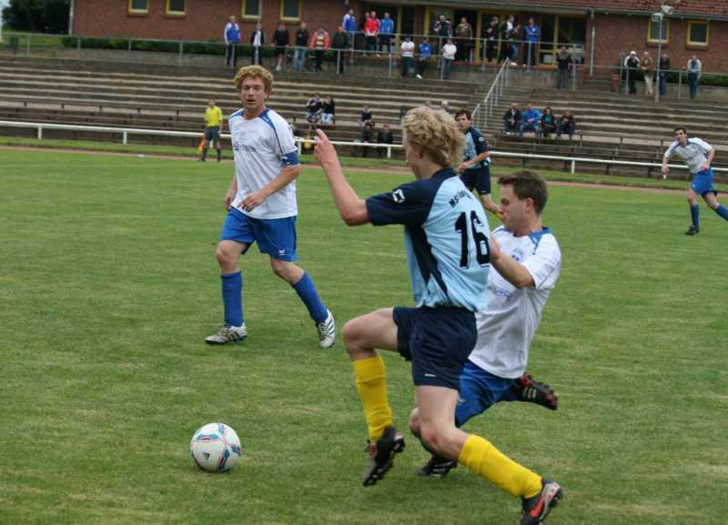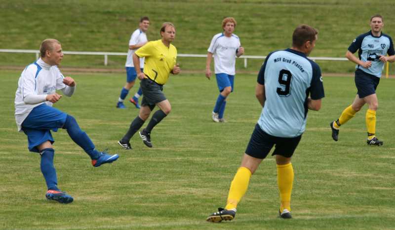 Nach einer kurzen Aufwärmphase versuchte der MSV erste vielversprechende Kombinationen Richtung Teterower Tor zu initiieren. Einen langen Ball leitete Kay Ruschin per Kopf weiter. Der Ball landete beim freistehenden Henning Voß, dessen Direktabnahme aus rund 10 Metern knapp über den Kasten strich (7.). Eine frühe Führung hätte den Plastenern gut zu Gesicht gestanden. In der Folgezeit hatte der MSV etwas mehr vom Spiel. Die Teterower verlegten sich ihrerseits aufs Kontern, vor allem über die schnellen Sebastian Döscher und Paul Gert. Die sichere Abwehr um den stellungssicheren Routinier René Duggert und dem schnellen, die Räume eng machenden Ricardo Twieg, ließ aber kaum ernsthafte Gefahr vor dem Kuhnert-Kasten aufkommen. Auf der sechser Position überzeugte Daniel Friemann. Er verlor so gut wie keinen Zweikampf. So war es nicht verwunderlich, dass auch die zweite Riesenmöglichkeit den Plastenern gehörte. Der immens fleißige Thomas Zühlke erkämpfte sich an der gegnerischen Grundlinie den Ball und passte auf dem am Fünfer freistehenden, aber leider den Ball nicht richtig treffenden Hannes Bauer (21.). Kurz vor der Pause nahmen die Mannschaften etwas das Tempo aus dem Spiel und versuchten ihr Heil mit langen Bällen. Kay Ruschin kam bei einem dieser Bälle eine Zehntel vor seinem Gegner an den Ball, der ihn auf der Strafraumgrenze von den Beinen holte. Ohne Pfiff ging es mit einem Teterower Konter weiter. Sebastian Döscher verzog daraufhin die beste Möglichkeit des SV 90 in der ersten Hälfte knapp.