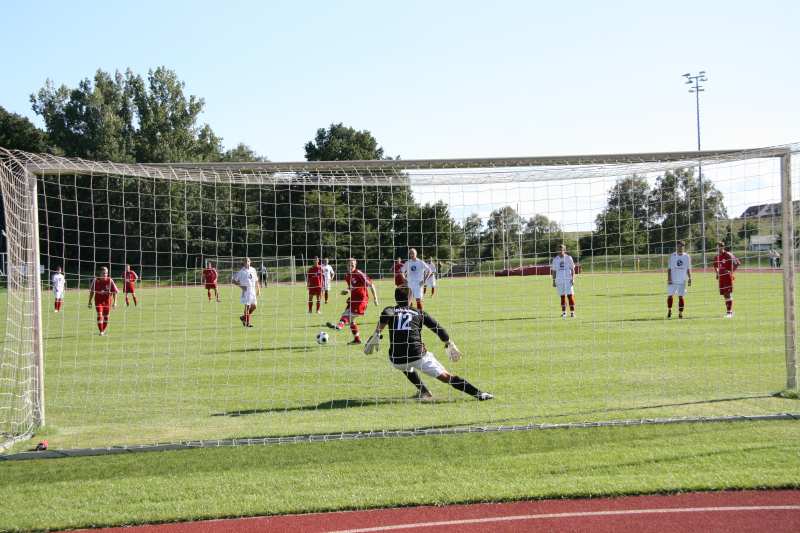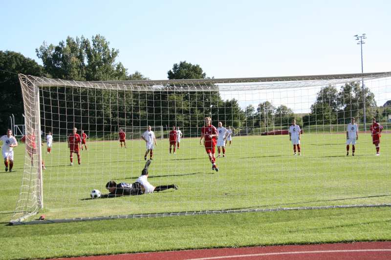 Dann aber wieder nur Angriffe vom SV 09. Wenn man der Mannschaft in dieser Phase etwas vorwerfen kann, dann nur, dass sie kein Tor erzielte. Andy Purlinski nahm im 16er den Ball nach einer schönen Ballstaffette über Guido Timper und David Schawaller gekonnt mit, zog direkt ab, allein Passow hatte etwas gegen den Torerfolg(30.). Auch als die Schaltstation im Warener Spiel Kapitän Michael Kaul auf Sebastian Döscher passte und Passow erneut glänzend reagierte schoss Jens Aepinus den Apraller neben das Tor (35.). Der nächste Angriff (36.), wieder schickte David Schawaller Guido Timper steil in den gegnerischen Strafraum, konnte im letzten Augenblick abgewehrt werden. Guido zögerte einen Moment zu lange mit dem Schuss. Zwei Minuten später folgte die Strafe auf den Fuß. Der Ball wurde in der eigenen Hälfte vertändelt, die Warener Abwehr war ein weiteres Mal nicht geschlossen und musste zusehen, wie Patrick Hildesheim allein auf Stefan Metelmann zulaufend gekonnt per Flachschuss in die lange Ecke zum 1:0 für die Gäste verwandelte. Keineswegs geschockt drängte Waren weiterhin auf einen Torerfolg. Immer wieder war David Schawaller an den Aktionen beteiligt. Er schickte seine schnellen Sturmpartner Sebastian Döscher, Jens Aepinus (43.), Guido Timper (44.) und Erik Gaedeke ein ums andere Mal gekonnt steil. Leider blieb bis zur Pause ein Torerfolg aus.