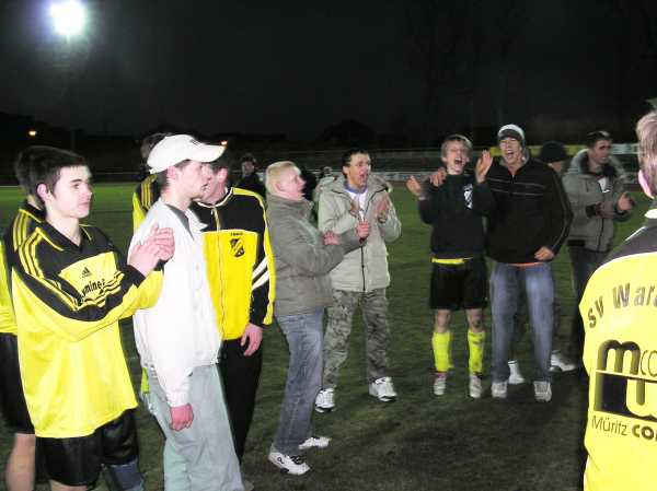Nach der blamablen Heimvorstellung gegen den 1.FC Neubrandenburg II (0:6-Niederlage) war im Bezirkspokal gegen Blau-Weiss Greifswald Wiedergutmachung angesagt. Der Kunstrasenplatz in Volksstadion von Greifswald war mit einer leichten Schneedecke überzogen, sodass die Spieler beider Mannschaften nicht nur ihre Gegner vor sich hatten, sondern auch einige Standprobleme. Zu Beginn des Spiels fing es dann auch noch an zu schneien. Die Warener ließen sich von diesem Umständen nicht beeindrucken und wollten ihren Trainern zeigen, dass sie das Fußball spielen nicht verlernt haben. Bereits zu Beginn der Partie setzten sie den Gastgeber unter Druck und gingen auch in der 5 min. nach einem Flachschuss von M. Meyne in Führung. In der 11 min. erhöhte dann der SV Waren 09 auf 2:0. Nach einer Ecke von T. Schwager war Kapitän C. Görtz mit dem Kopf zur Stelle und versenkte den Ball im Greifswalder Tor. Wer dachte, die 09-Jungs ließen es nun ruhiger angehen sah sich getäuscht. Die 09-Jungs spielten konzentriert weiter und drückten bereits in der I. Halbzeit auf die Entscheidung. In der 26 min. erhöhte C. Görtz dann auf 3:0, ehe T. Reichau in der 33. und 37. min. mit seinen beiden Toren den Halbzeitstand von 5:0 erzielte.