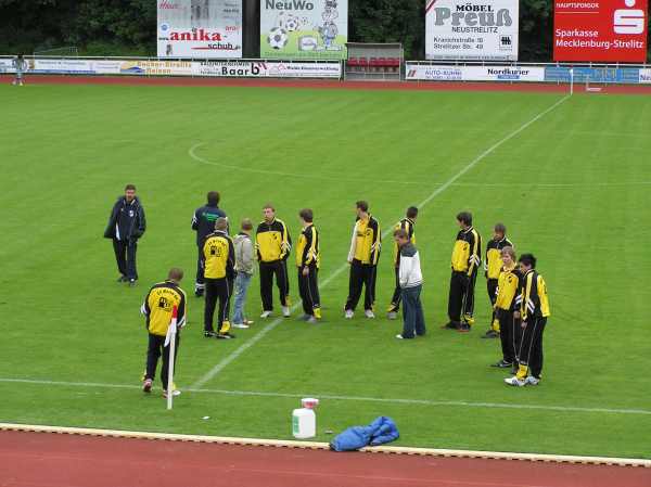 Dabei konnte die Marschroute der 09-Jungs nur lauten, solange wie möglich die „0“ halten. Dementsprechend wurden die Schützlinge der Trainer Seidel und Disteler durch diese eingestellt. Aus einer kompakten Abwehr heraus sollte das Spiel der Neubrandenburger gestört werden. So konnten die Warener das Spiel in den ersten zehn Minuten offen gestalten und hatten auch durch Görtz sogar eine Chance in Führung zugehen. In der 12 Minute passierte dann das, was die Warener verhindern wollten. Einen zu kurzen Abwurf von Wegener auf Voß, spielte dieser vor dem eigenen Strafraum noch einmal quer und die Gäste ließen sich nicht zweimal bitten und gingen mit 1:0 in Führung. Bei vielen der Zuschauer ging der Gedanke zurück an die Hinrunde, als die 09-Jungs im heimischen Müritzstadion mit 0:6 unter die Räder kamen. Die Warener wurden durch die Trainer nun wieder aufgemuntert, den Kopf nicht hängen zu lassen, sondern weiter zu kämpfen. In der Folgezeit wurde das Spiel wieder offener, wobei die Gäste größte Chancen ausließen. Die Warener zeigte eine kämpferisch geschlossene Mannschaftsleistung und wurden in der 37 min. für ihre Bemühungen belohnt.