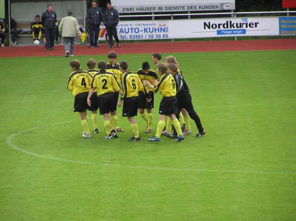 Die Partie begann aus Sicht der Warener auch recht verheißungsvoll. Gleich in der 1 min. gelang C. Görtz nach einer Einzelleistung im Strafraum der Gäste die 1:0-Führung für den Außenseiter. Hier merkte man, dass sich die Warener Jungs für dieses Finale sehr viel vorgenommen hatten. Bereits in der 10 min. konnte der wiedergenesene M. Mrowka auf 2:0 für die Müritzer erhöhen. Die Neubrandenburger waren zu diesem Zeitpunkt sichtlich bedient, hatten aber nun die richtige Wut im Bauch, dem Gegner Paroli zu bieten. In der Folgezeit entwickelte sich ein munteres Spiel mit Chancen auf beiden Seiten. Im Tor der Warener bot Benjamin Wegener wieder ein überragendes Spiel und machte mehrere Chancen der Neubrandenburger zunichte. In der 16 min. war er allerdings machtlos. Ein Fehlpass von M. Evert am eigenen Strafraum leitete den Anschlusstreffer ein. Ein flache Hereingabe des Neubrandenburger Stürmers verwandelte dessen Kollege zum Anschlusstreffer. Die Warener die zu diesem Zeitpunkt das Spiel bestimmten, waren sehr geschockt. Vor allem M. Evert merkte man eine kleinere Verunsicherung an. Aber man führte noch mit 2:1. Bis zur Halbzeit verlief die Partie dann auch weiter abwechselungsreich mit Chancen auf beiden Seiten. Nach der Pause das gleiche Bild. In der 51 min. nutzten die Neubrandenburger dann eine ihrer Chancen zum Ausgleich. Nun war das Spiel wieder offen. Keine der beiden Mannschaften wollte den Rückstand hinnehmen. So blieb es dann bis zum Schluss beim leistungsgerechten Unentschieden zwischen beiden Mannschaften. Da es an diesem Tag aber einen Sieger geben musste, ging es in die Verlängerung von 2x10 min. Auch hier das gleiche Bild wie in der regulären Spielzeit. In der 99 min. überspielten die Neubrandenburger dann die etwas zu weit aufgerückte Abwehr der Warener und erzielten die glückliche 3:2 Führung. Die 09-Jungs waren bereits zu diesem Zeitpunkt völlig am Boden zerstört. In der verbleiden Spielzeit kam man nochmals vor das Tor der Neubrandenburger konnte aber den Ausgleich nicht mehr erzielen. Nach einer gutklassigen Partie gewann am Ende der Glücklichere.
