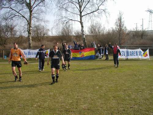 Die Zuschauer erwarteten nach den letzten überzeugenden Leistungen der Mannschaft auch heute wieder feinste Fußballkost von ihrer Mannschaft. Und es schien so als ob der Spielfreude der Mannschaft kein Gegner etwas anhaben kann. Stadionsprecher Wolfgang Burau war noch beim Verlesen der Mannschaftsaufstellungen, da lag der Ball schon im gegnerischen Tor. Fünf Minuten später hätte Matvij Nykolaychuk aus zwei Metern Entfernung den Ball freistehend vor dem Tor zum 2:0 unterbringen müssen, kurz darauf entschärfte der gute Rostocker Torwart einen platzierten Kopfball von Andre Schröder. Das Spiel schien gelaufen, dachten wohl auch die Verteidiger. Ringo Scholz, einer der besten Torschützen der Liga, konnte jedoch ungehindert mit dem Ball durch die gesamte Warener Hintermannschaft spazieren und den 1:1 Ausgleich erzielen. Hätte nicht Matvij Nykolaychuk postwendend in der 22. Minute per Freistoß die erneute Führung erzielt, wer weiß, wie das Spiel gelaufen wäre. Der Spielfluß war völlig dahin. Stückwerk an allen Ecken und Kanten, man hatte das Spiel völlig aus den Händen gegeben. Glücklicherweise hatten die Gäste nur einen Stürmer vom Format Ringo Scholz. So dauerte es bis zur 72. Minute, bis das vorentscheidende 3:1 per Foulelfmeter nach einem Foul am wiedergenesenden Serhij Bohorodichenko durch Matvij Nykolaychuk fiel. In der Schlußphase fielen die Treffer dann wie reife Früchte. Andy Purlinski marschierte auf rechts nach vorn und passte mustergültig quer auf Serhij Bohorodichenko, der den gegnerischen Torwart zum 4:1 tunnelte. Als Andre Schröder nach guter Vorarbeit von Stefan Haase das Tor nicht erzielen konnte, verkürzte der Rostocker FC wiederum durch ihren gefährlichsten Stürmer Ringo Scholz auf 2:4. Die zehn Minuten vor dem Ende aufkeimende Hoffnung des Gegners erstickte Andy Schröder mit einem Treffer vom Elfmeterpunkt, nach Foul am besten Warener Mirko Löper. 5:2 der Endstand in einem Spiel, das diesmal nicht in der Eleganz den Höhepunkt hatte, sondern in der sonst so vermissten Chancenverwertung. Dem regelmäßigen Zuschauer im Warener Müritzstadion werden im Laufe dieser Saison jedenfalls alle Fassetten des Fußballsports geboten. Kommen sie doch auch mal ins Stadion und schauen sich diese tolle Mannschaft an, sie werden sicherlich für einige fußballerische Defizite in der Mecklenburger Fußballwelt entschädigt. Übrigens auch das Müritzstadion gleicht sich allmählich an die Leistungen der Mannschaft an. Es wird eine tolle Arena! |