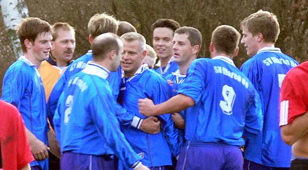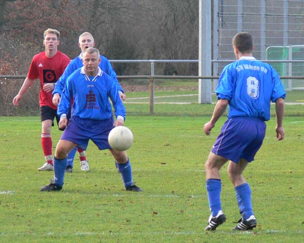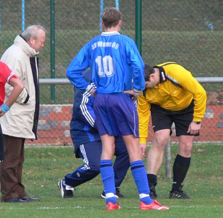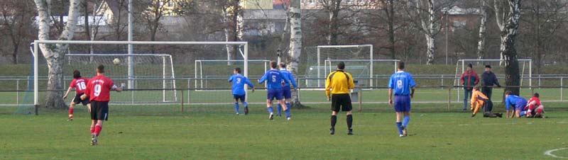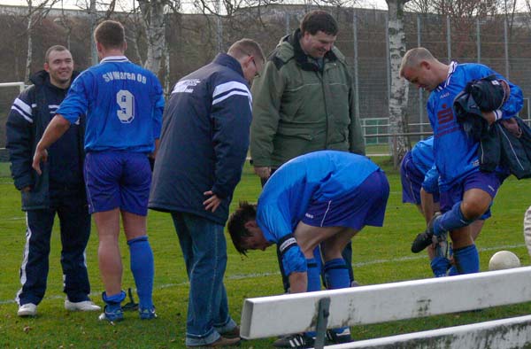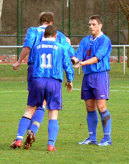 Gehandicapt durch etliche Verletzungen hatte 09 nur 14 Spieler zur Verfügung, wobei schon Torwart Ralf Siegmund und Trainer André Schröder von den Alten Herren zur Mannschaft stießen. Die Verletztenliste sollte sich noch erweitern,denn Sebastian Schwartz musste in der 35.Minute verletzt ausgewechselt werden. Offensivmann Thomas Fiedel ersetzte ihn und machte auf der rechten Abwehrseite ein richtig gutes Spiel. In der ersten Halbzeit war zu erkennen, dass 09 nicht wie in den letzten Spielen in Rückstand geraten wollte. Daher agierten die Warener vorsichtig und zurückhaltend. Die TSG hatte auch im Mittelfeld Freiräume, nutzten diese jedoch nicht aus. Die Chancen auf ihrer Seite waren nicht zwingend genug. Die Müritzstädter hatten zwar auch nicht so viele Torgelegenheiten, doch diese waren ungleich besser. So kam zum Beispiel ein verunglückter Torschuss von René Röpcke zu Hannes Bauer, der freistehend am Torhüter scheiterte. Auch ein Schuss von René Röpcke verfehlte das Ziel nur knapp. Als Steffen Jacobs in der 42.Minute freigespielt wurde, ließ er sich nicht zweimal bitten und schob sicher zum 1:0 ein.