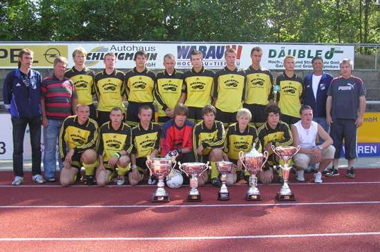 stehend v.l.n.r.: Joachim Abram (Mannschaftsbetreuer), Peter Abram (Trainer), Rico Peschel, Sandro Stoll, Stefan Paetzke, Matthias Wackerow, Christian Wildermann, Hannes Bauer, Stefan Durke, Robert Krenz (Kapitän), Holger Stebis (Mannschaftsbetreuer), Klaus Schardin (Co-Trainer)