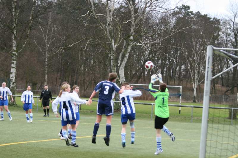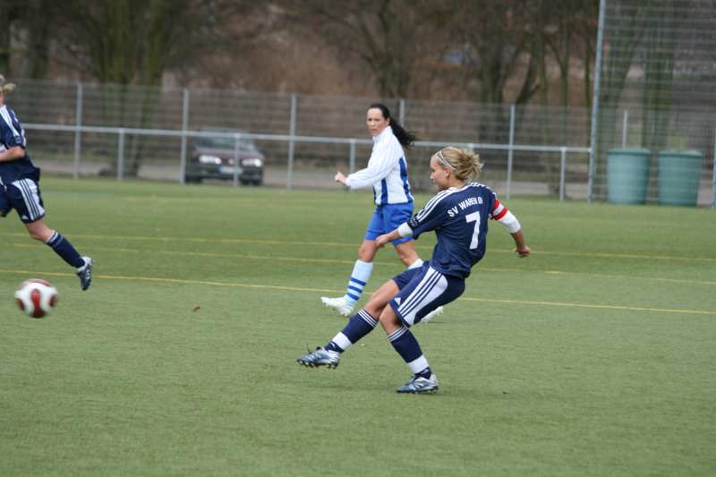 Kaum erwarten konnten die Frauen des SV Waren 09 das erste Pflichtspiel der laufenden Saison im neuen Jahr. Zu Gast waren die Kickerinnen vom SV Hafen Rostock 61 II. Es war bereits das 3. Aufeinandertreffen beider Teams in dieser Spielzeit. Alle Begegnungen hatten die Frauen von der Müritz bisher für sich entschieden. Daran sollte sich natürlich auch in dieser Party nichts ändern. Beide Mannschaften boten in den ersten Minuten kein gutes Spiel. Immer wieder wurde mit hohen Bällen versucht ein Spiel aufzubauen. Aber bei sehr windigen Bedingungen machten diese Aktionen wenig Sinn. Bis auf einen Schussversuch aus 18 Metern von Lisa Barner in der 15. min, den die Torhüterin der Rostocker aber locker halten konnte, passierte auf Seiten der Warenerinnen in der ersten Viertelstunde nicht viel.