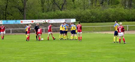 (PB/AP) Die erste Halbzeit begann nun nicht gerade für Waren positiv. Nachdem bereits in der 3. Minute Eintracht Zinnowitz in Führung gegangen war, sah es so aus, als wenn unter dem Warener Kessel noch nicht genug das Feuer geschürt war. Viele vergebene Torchancen trugen nicht gerade zur Freude der Spieler und der Zuschauer bei. So mußte Trainer Abram in der Pause doch einige ernste Worte an seine "Jungs" richten. Ja, und das schien auch wirklich etwas bewegt zu haben. Fünf Minuten nach Beginn der 2. Halbzeit brachte Maxi Biegel den Ausgleich für Waren. Aber erst weitere 14 Minuten später konnte Waren in Führung gehen. Nachdem M. Biegel die Warener mit seinem zweiten Tor in Führung brachte, war es wohl so etwas wie eine Aufforderung, das Können unserer Mannschaft unter Beweis zu stellen.. Von nun an ging es Schlag auf Schlag. Die Zinnowitzer sichtlich genervt, brachten nichts mehr zu Wege. Mehrere Spieler setzten sich auf den Rasen und mußten aufgefordert werden, aufzustehen. So hat M. Biegel heute 3 Tore für sich verbuchen könne. Gefallen hat Tino Neue. Als C-Junioren Spieler rackerte er unermüdlich. Er war für Ch. Bachert, der aus Verletzungsgründen in der 30. Minute ausschied, aufs Feld gekommen. Und wieder muß man sagen, dass die gute Kondition unserer Mannschaft sich auszahlte. Auch hier war die Überlegenheit gegenüber Zinnowitz eindeutig sichtbar. |