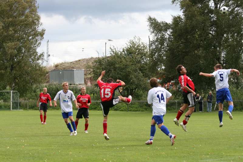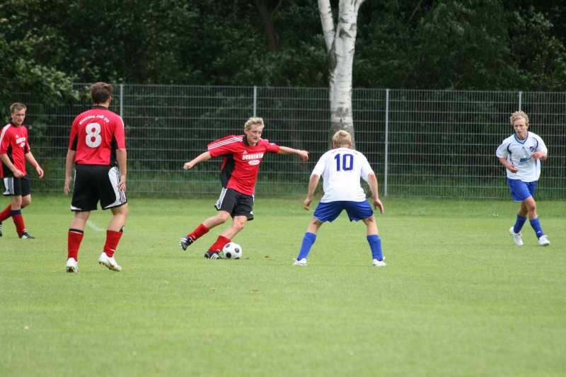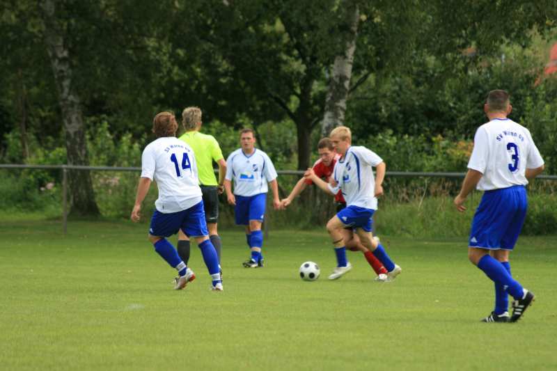 Danach hatte JuS Vorteile im Spielaufbau, 09 aber die deutlich besseren Chancen. In der 30. und 38. Minute schoss Tobias Reichau allein vor dem Tor stehend den Torwart an. Dazwischen konnte der kleine Warener nach Flanke von links alleinstehend aus fünf Metern Entfernung zur 2:1 Führung einköpfen. Vier Minuten später strich ein 20m Aufsetzer von Björn Henning knapp am Kasten vorbei. In der Nachspielzeit der ersten Halbzeit führte der schönste Angriffszug zur 3:1 Führung. Chris Görtz setzte sich rechts durch, passte auf Stephan Pomorin, der weiter quer legte auf den freistehenden Daniel Reichau. Kein Problem für den Warener Center. Vor der Pause lag der Ball dann noch einmal in den Maschen. Diesmal auf Warener Seite. Nach einer glänzenden Parade von Robert Martinek landete der Ball bei Phillipp Schröder, der aus Abseitsposition den Ball über die Linie drückte. So blieb es zur Pause beim 3:1.