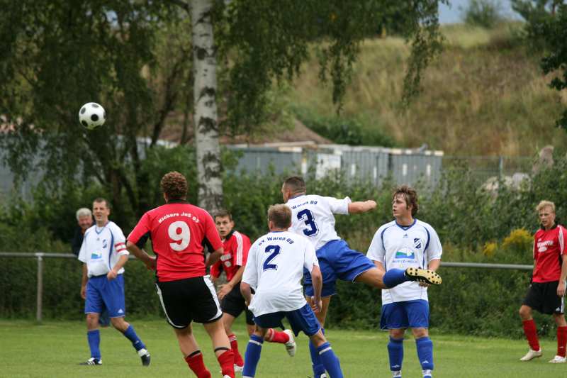 Im letzten Jahr verlor man beide Spiele gegen Kickers JuS. Dass sollte nach dem guten Start in Malchow in diesem Jahr anders laufen. Der erste gefährliche Angriff brachte dann auch schon die Warener Führung. Robert Friske setzte sich auf der rechten Seite durch und flankte gefühlvoll ins Angriffszentrum. Dort köpfte Chris Görtz an die Latte, der Abpraller fand über den Rücken des Gästetorwartes den Weg über die Torlinie.