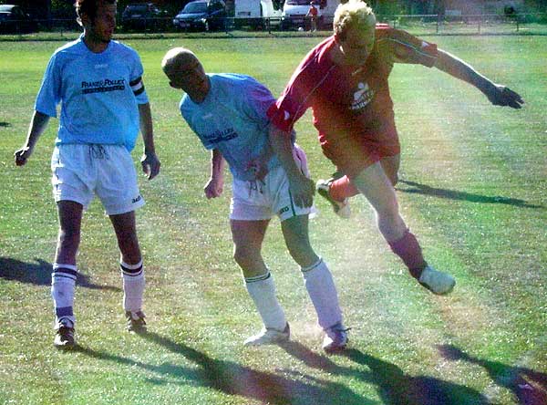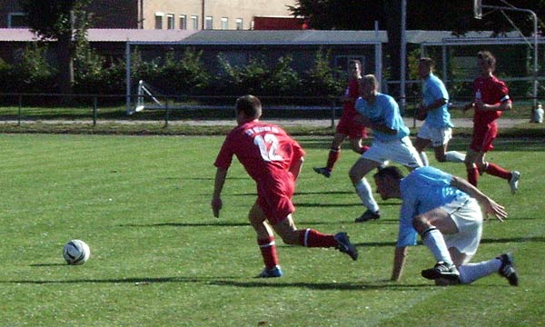 (gre)Die ersten Angriffe der Gastgeber wurden zunächst sicher abgewehrt. Und als diesmal die sich bietenden Chancen genutzt wurden, waren die Gastgeber ziemlich ratlos und konnten nur ihr kraftaufwendiges Kampfspiel entgegensetzen. Nachdem Marko Siegfried einen Freistoß aus halbrechts direkt durch die Mauer ins kurze Eck verwandelte und Andy Purlinski nach einem schönen Angriffszug, der über die linke Seite von Björn Knodel eingeleitet wurde, auf 2:0 erhöhte, schienen die Warener diesmal ihre spielerische Überlegenheit auch in Punkte ummünzen zu können. Leider musste der bis dahin agilste Warener Mittelfeldspieler Björn Knodel nach einem rüden Einsteigen eines Mirower Spielers nach einer halben Stunde verletzungsbedingt ausgewechselt werden. Dem Offensivspiel wurde dadurch ein wichtiger Baustein entzogen. Die Mirower versuchten jetzt mit ihrer robusten Spielweise die Warener zu beeindrucken. Bei einem Lattenschuss hatten die Warener noch Glück, in der letzten Minute der ersten Halbzeit zeigte Schiedsrichter Müller zur Verwunderung aller beteiligten nach einem harmlosen Kopfballduell im Warener Strafraum auf den Elfmeterpunkt. Mit einer grandiosen Reaktion verhinderte Robert Martinek den Anschlusstreffer. Kurz vor der Pause sollte das eigentlich der Genickschuss für den Gastgeber gewesen sein.