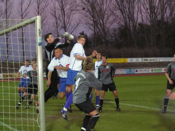 11. Bentwischer Verteidiger legt den Ball Andy Purlinski auf, dessen Direktschuss streift die Lattenoberkante