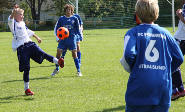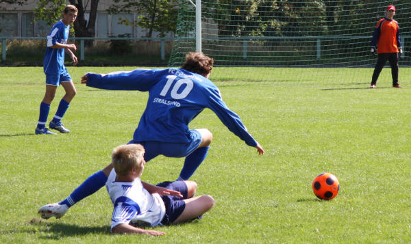 Großes Glück hatten die Warener Kicker in der 16.Minute, wo der sonst sichere Rückhalt J. Köhler nicht glücklich ausgesehen hatte, die Stralsunder aus dieser Situation (jedoch zum Glück der Warener) nicht mehr aus der Situation machten.