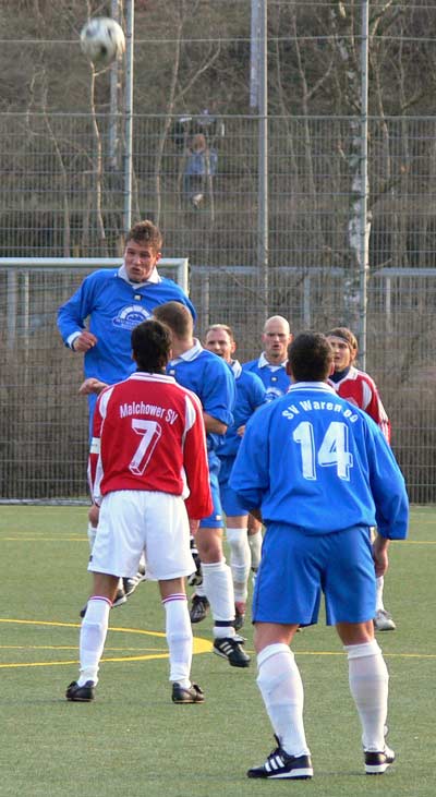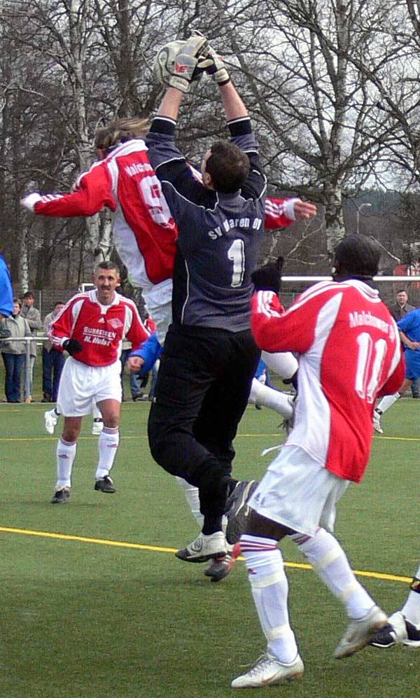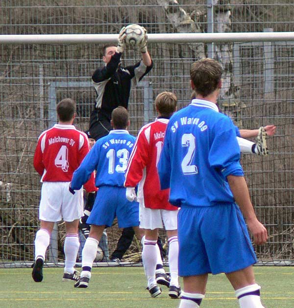 Dem Trainerduo Andre Schröder und Thomas Vierow fehlten mit Nico Schwerin, Guido Timper, Michael Kaul, David Haupt und Rene Drabner zwar wichtige Stützen in der Mannschaft, jedoch ging man optimistisch ins Spiel. In der ersten Halbzeit war gerade im Mittelfeld die Unerfahrenheit und die fehlende Spielpraxis einiger Warener Akteure zu erkennen, so dass der Gast das Spiel dominierte, ohne sich jedoch zwingende Chancen zu erspielen. Gefährlich wurde es im Warener Strafraum nur bei Standards wie Freistößen und Eckbällen. Dabei war das Abwehrverhalten der Hintermannschaft oftmals nicht souverän genug. In der 29. Minute wieder ein Freistoß von der Mittellinie. Der Ball war sehr lange in der Luft. Trotzdem gelang es den Abwehrspielern und dem Torwart nicht den Ball zu klären, so dass die Kugel vom Kopf des Malchower Stürmers Puschkaruk zum 1:0 für Malchow ins Netz befördert wurde. Die Führung der Gäste zu diesem Zeitpunkt sicherlich verdient. So ging man in die Halbzeitpause. Nach Wiederanpfiff sahen die ca. 650 Zuschauer eine völlig andere Warener Mannschaft. Man ging jetzt konzentriert zu Werke, gewann die Zweikämpfe und hatte in der 48. und 52. Minute nach Angriffen über die rechte Seite zwei gute Möglichkeiten durch Döscher. In der 57. Minute jagte Strübing den Ball über die Querlatte. Torwart Andreas Haase hatte in der 62. Minute nach einem Freistoß aus ca. 20 Metern die erste Möglichkeit sich auszuzeichnen. In der 66. Minute setzte sich Christian Senkpiehl auf der rechten Seite schön durch, seine Flanke von der Grundlinie erreichte Stefan Haase, der einen Flugkopfball ansetzte und aus ca. 10 Metern den Ball per Kopf zum 1:1 versenkte. In der 73. Minute dann fast das gleiche Bild, Flanke von Senkpiehl und mutiger Seitfallzieher von Daniel Reichau. Der Ball verfehlte knapp das Tor. In der 80. Minute stockte den Warener Fans und der Mannschaft der Atem, als der Unparteiische plötzlich auf Elfmeter für Malchow entschied. Abwehrspieler Marcel Störr war der Ball an die Hand gesprungen. Torhüter Andreas Haase spekulierte auf die richtige Ecke und konnte den Rückstand nach großartiger Parade verhindern. Nach 90 gespielten Minuten warteten die Spieler und Zuschauer bereits auf den Abpfiff, als wieder in Strafraumnähe durch einen Abwehrspieler ein vermeidbares Foulspiel begangen wurde. Der Ball segelte nach Freistoß durch den Strafraum, wieder an allen Warener Abwehrspielern vorbei und der eingewechselte Kollmorgen bedankte sich mit einem Kopfballtor zum 2:1 der Gäste für die Freizügigkeit in Tornähe. Somit musste sich der SV Waren 09 mit der, sicherlich vermeidbaren Niederlage abfinden. Bei etwas mehr Konzentration und weniger Foulspiele in Strafraumnähe wäre eine Punkteteilung sicherlich angemessen gewesen. Malchow hatte Vorteile in der ersten Halbzeit, der Gastgeber beherrschte die zweiten 45 Minuten.