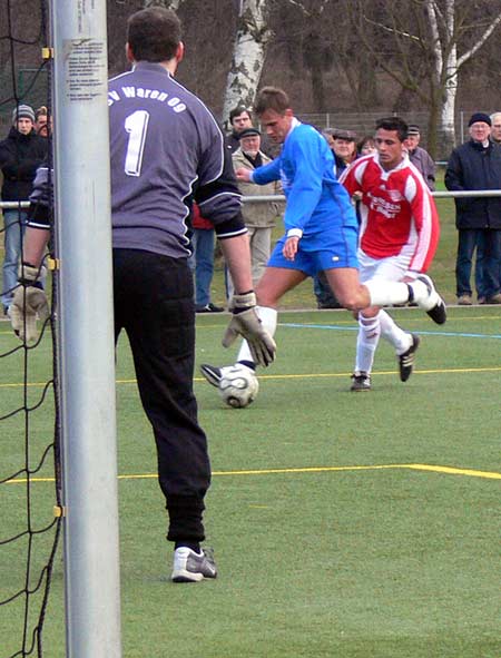 Aber auch in Waren hat man sich gut auf die Rückrunde vorbereitet. Drei Oberligisten (Hansa II, Neuruppin und Torgelow) waren nicht in der Lage, in der Vorbereitung ein Tor gegen den SV Waren 09 zu schießen. Allerdings war auch die eigene Torausbeute eher gering. Vor allem im ersten Punktspiel nach der Winterpause traten die Defizite in der Chancenverwertung erneut zu Tage. „Das können wir aber kaum trainieren“ so der neue Warener Trainer. Weiß er doch als ehemaliger Stürmer selbst genau, dass man im Abschluss so seine Phasen hat. Mal sitzt jeder Schuss und in einer nicht so prickelnden Zeit geht jeder Versuch daneben. Dass die negative Phase bei den Angreifern ein Ende hat, darauf wartet nicht nur der Trainer. Es ist umso wichtiger, weil nach der guten Vorbereitung von der Stammelf vier wichtige Akteure fehlen. Guido Timper handelte sich in Neubrandenburg die fünfte gelbe Karte ein und nachdem Nico Schwerin sich gegen Torgelow einen Trümmerbruch an der Nase zuzog, erwischte es auf dem Neubrandenburger Kunstrasen gleich zwei Spieler schwer. David Haupt zog sich einen Bänderriss im Fußgelenk zu und der sich gerade zum Regisseur im Warener Spiel entwickelnde Michael Kaul fällt mit einem Knochenbruch im Fuß ebenfalls mehrere Wochen aus.