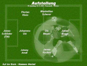 Auch in der Folgezeit wurde das Spiel nicht sehenswerter. Der Ball wurde fast ausschließlich durch die mitte gespielt und blieb dann beim Gegner hängen. Das lag sicherlich auch daran das der sonst im Mittelfeld kreativ agierende Johannes Ott auf die Verteidigerposition von Christian Heinz rücken musste. In der 26.Minute hatte dann Julian erneut die Chance den Führungstreffer zu erzielen in dem er allein auf den Torwart zulief. Hier hatte er sich allerdings den Ball zu weit vorgelegt und der Torwart konnte den Ball ohne Probleme wegschlagen. Von den Pasewalker Spielern war zu diesem Zeitpunkt ebenfalls nicht viel zu sehen. Diese kamen dann aber auch zu einigen Chancen, da unsere komplett neu aufgestellte Abwehr einige Abstimmungsprobleme bzw. Stellungsfehler hatte. In der 34.Minute wurde dies dann prompt bestraft und Pasewalk erzielte das 0:1 aus Warener Sicht.