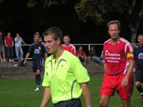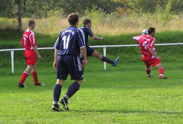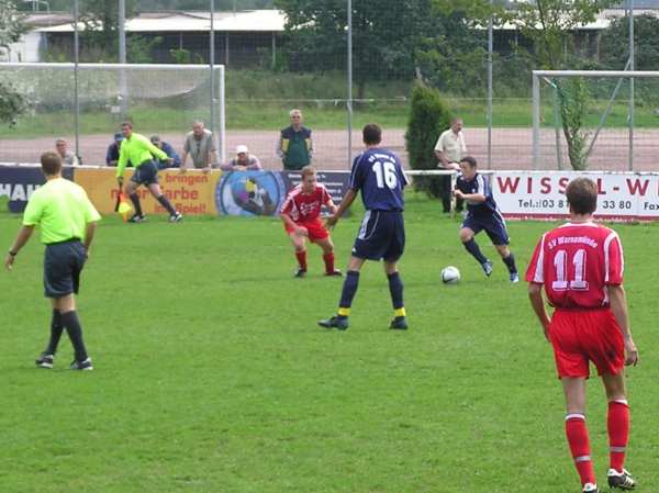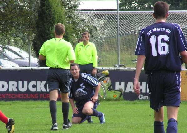 So gut wie die Truppe in den ersten 25 Minuten gespielt hat, so stark hat sie in der zweiten Halbzeit nachgelassen. Die Warnemünder sind extra auf den zweiten Platz ausgewichen, weil sie sich auf dem etwas holprigen Geläuf wahrscheinlich einige Vorteile erhofft haben. Die Mannen um den Ex-Hansa-Spieler Heiko März mussten anfangs die deutliche Überlegenheit des Verbandsligisten akzeptieren. Schnell und direkt wurde in die Spitze gespielt. Schon in der 5. Minute schloss David Haupt mit einem straffen Schuss aus 14 Metern Entfernung nach schönem Zusammenspiel mit Christian Senkpiehl und Stefan Haase zum 1:0 ab. Weiter ging es Richtung Gastgeber-Tor. David Haupt passte auf Guido Timper (6.), der spielte einen zentimetergenauen Pass auf Stefan Haase und der junge Warener verzog ähnlich wie der große Roy Makaay vor einer Woche gegen Nürnberg. Nur sieben Minuten später nahm Ronny Strübing einen langen Ball vor der Grundlinie auf, spielte auf Stefan Haase zurück und dessen präzise Flanke köpfte René Röpcke in die Maschen. Die deutliche Überlegenheit der Warener führte in der Folgezeit zu den bekannten Aussetzern, wenn man sich überlegen fühlt. So hatte Sören Albrecht nach einem Eckball und einer Kopfballverlängerung keine Mühe zum 1:2 einzuköpfen. Alle Abwehrspieler liefen auf den ablegenden Spieler zu und ließen den Warnemünder völlig allein stehen. Noch konnte das lässige Abwehrverhalten durch gute Angriffsleistungen kompensiert werden. Als Michael Kaul scharf Richtung Tor schoss wurde der Ball abgeblockt. Guido Timper nahm den Ball direkt und verwandelte zum 3:1. In der 38. Minute knallte der lange Warener noch einen Freistoß an den Pfosten und die Zuschauer erwarteten einen deutlichen Sieg.