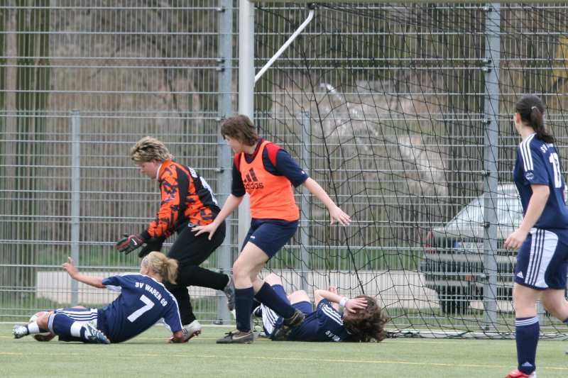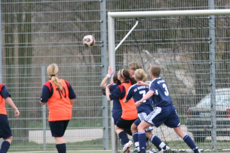 Kurz nach Anpfiff des Schiedsrichters hatte Annika Bernitt vom SV Waren 09 die erste Möglichkeit zum Führungstreffer. Aber sie bekommt den Ball nicht unter Kontrolle und legt sich dann die Kugel auch noch zu weit vor. Somit hatte die Torfrau des MSV Lübstorf keine Schwierigkeiten zur Klärung dieses Vorfalles. Nach einer Ecke von Claudia Perleberg in der 12. min, konnte Lisa Barner den Ball aus 6 m nicht im Gehäuse der Gäste unterbringen. Nur zwei min. später spielte Lisa Barner einen hohen Ball in den Strafraum des MSV. Anika Bernitt versuchte die Kugel mit dem Kopf über die Torfrau zu köpfen. Dieses misslang, weil die Torfrau reflexartig die Hände nach oben riss und den Ball so abwehren konnte.