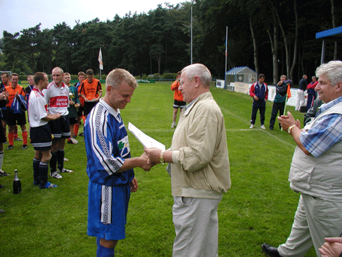 Ehrung für den Turnierzweiten: Der Kapitän des SV Waren 09 nimmt die Urkunde und den Pokal entgegen |