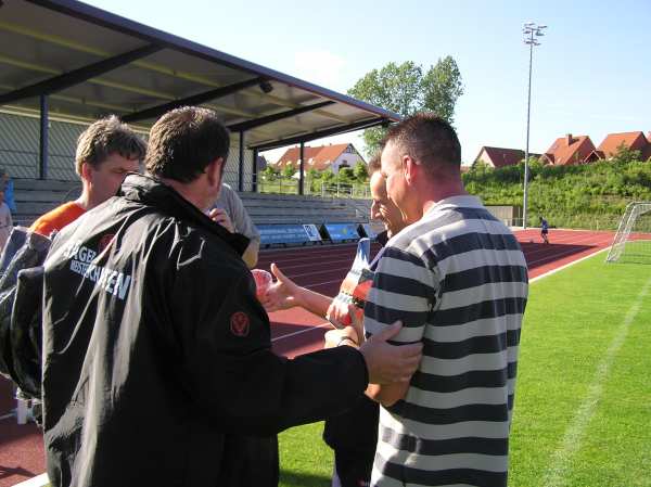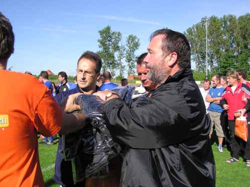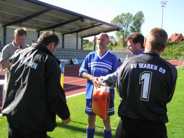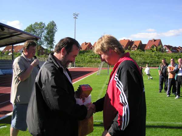 | Der ehemalige Torwart des FC Hansa Axel Hauschild nimmt die Glückwünsche von Herrn Poschmann von der Firma Jägermeister entgegen. Der SV Titanic mit mehreren ehemaligen Hansa-Spielern belegte den 4. Platz. |