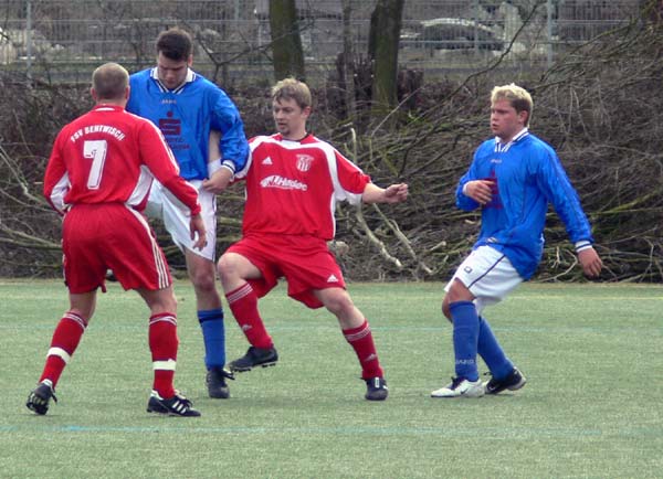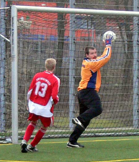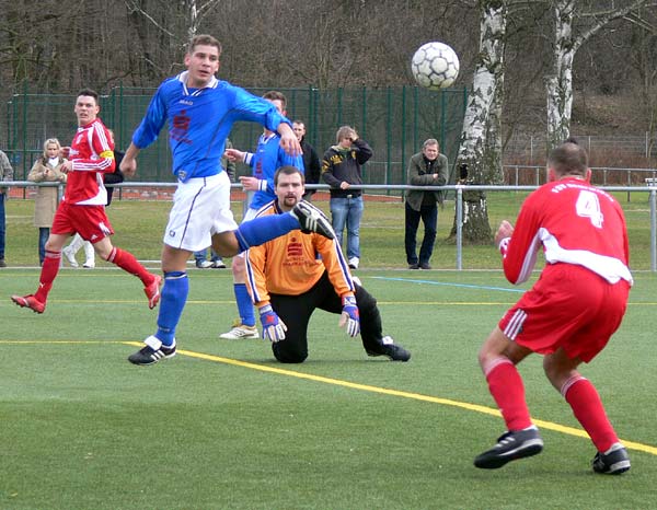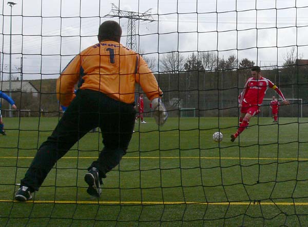 Einen wahren Torreigen bot Theo´s Elf bei strahlendem Sonntagswetter. Bereits nach sieben Minuten war der an diesem Tag vorbildlich spielende Stefan Durke auf seiner Position nicht mehr zu halten und schoss platziert in die linke Ecke zum Führungstreffer. Leider folgt auf dem Fuße die Ernüchterung und ein leichtfertig gespielter Querpass vor der Abwehr landet beim Gegner und wird nach einer Flanke zum Ausgleich verwertet.