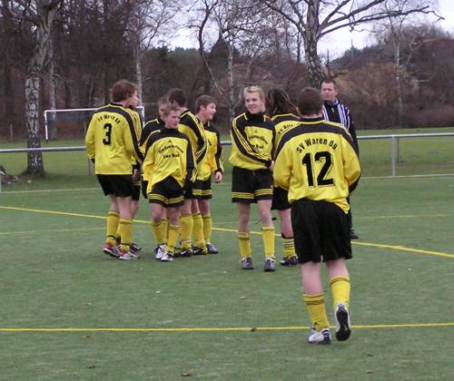 Nach der Pause spielten die Warener mit dem Wind im Rücken. Durch die Trainer wurde die Devise herausgegeben, den Ball flach zuhalten und Schüsse aus der zweiten reihe abzugeben. Wer nun dachte, die Warener Führung ist eine Frage der Zeit, sah sich getäuscht. Nach einem Konter in der 47 min. gingen plötzlich die Gäste in Führung. Das Gegentor hinterließ bei den Spielern einige Zeit Spuren. So vergingen 10-15 min. bis die 09-Jungs wieder zu ihrem Spiel fanden und ihre Stärke, den Kampf, zeigten. Mit der Einwechslung des C-Junioren, T. Reichau, wurde der Angriffsdruck der Warener noch stärker. Vor allem über die rechte Seite wurde nun Druck erzeugt. So war es Th. Fiedel in der 72 min., der nach einer Flanke von T. Neue den längst fälligen Ausgleich erzielte. Nun waren die 09-Jungs wieder im Spiel und sie setzten nach. In der 76 min. erzielte dann T. Reichau, nach Pass von C. Görtz, die völlig verdiente Führung für die Warener. Nun war das Spiel gelaufen, denn die Warener brachten dieses Ergebnis völlig verdient über die verbleibende Zeit. Ein gelungenes Comeback nach seinem Armbruch im C-Junioren-Bezirksfinale im Juni feierte T. Schwager, der in der Rückrunde dann zu alter Stärke wieder finden will und der Mannschaft weiter auf dem weg nach oben helfen will.