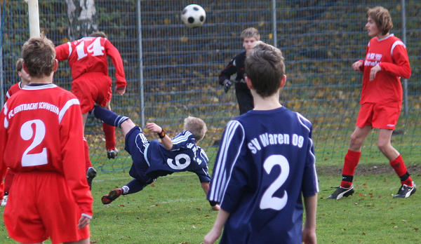 Und genau deshalb begann unsere Mannschaft äußerst druckvoll diese Partie und zeigte dem Gast aus Schwerin schon in der Anfangsphase wer hier Herr im Hause ist. Besonders auffällig war in der Anfangsphase das neu formierte Sturmduo um M.Scherer und J.Braun sowie die neu besetzte linke Außenbahn mit M.Ries die ordentlich Druck auf die gegnerische Abwehr ausüben konnten und diese gleich mehrmals in Verlegenheit brachten. Wie zum Beispiel in der 9.Minute wo nach perfekten Zusammenspiel von M.Scherer mit M.Krolikowski das 1:0 erziehlt wird. Doch leider Fehlanzeige!!! Der Treffer wurde zu unrecht wegen Abseits aberkannt. Auch die nachfolgenden Szenen gehören dem SV Waren 09, der dieses Spiel zu diesem Zeitpunkt kontrolliert. Der Gegner reagierte zu diesem Zeitpunkt nur mit weiten Abschlägen und hohen Bällen. Das wiederum sorgte für Probleme in unserer Hintermannschaft, die nicht konsequent den Ball klären oder ins Seitenaus befördern konnte. In dieser Phase haben die Warener auch Glück denn in der 24.Minute übersieht der Schiedsrichter ein klares Foulspiel von K.Böhm am Gegenspieler im eigenen Strafraum und somit den berechtigten Elfmeter gegen die Warener. Nur wenige Minuten später sorgte wiederum eine Verunsicherung in unserer Hintermannschaft für Gefahr und diesmal für das 0:1 (19.Min.) wo wieder mal die Zuordnung in der Defensive nicht stimmt, aber das Tor auch aus äußerst abseitsverdächtiger Position erziehlt wurde. Wenig geschockt von diesem Treffer entwickelte sich aus Warener Sicht ein schnelles Spiel mit weiteren sehr guten Möglichkeiten, die leider zu oft wegen Abseitsstellung (diesmal) berechtigt abgepfiffen wurden. Die beste Möglichkeit, den Ausgleich zu erzielen, hatte J.Braun eine Minute vor Ende der ersten Hälfte, wo er allein auf den Torwart zuläuft, das vorherige Zuspiel von M. Krolikowski jedoch wegen Abseits erneut abgepfiffen wird.
