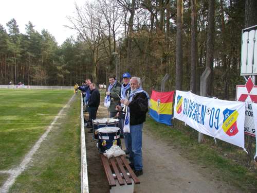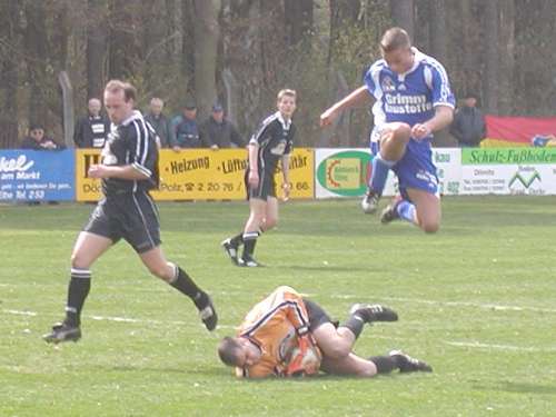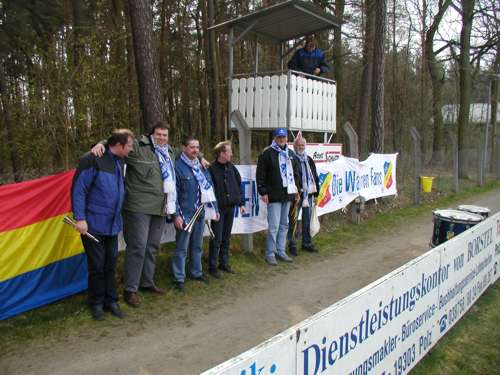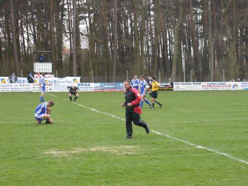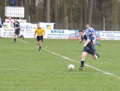 An die äußerste Westgrenze von Mecklenburg/Vorpommern musste unsere Verbandsligamannschaft und ihr treuer Anhang reisen, um das Punktspiel gegen Polz aus der Hinrunde nachzuholen.Unsere Mannschaft war gewarnt, denn hier haben schon einige Favoriten Punkte gelassen, so zuletzt auch der Sievershäger SV. Wir begannen auch sehr konzentriert die Angriffe über die Außenpositionen zu starten, der Torerfolg stellte sich aber zunächst nicht ein, da die Polzer Abwehr sehr vielbeinig und gut gestaffelt verteidigte.Der junge Stefan Haase über links und Andy Purlinski über die rechte Seite sorgten jedoch immer wieder für Gefahr im gegnerischen Strafraum. Unsere Abwehr mußte im Gegenzug jedoch höllisch aufpassen, denn die Konter des Gegners waren immer gefährlich. So hatten wir in der 20., 32. und 31. Minute brenzlige Situationen zu überstehen, als die agilen Stürmer aus Polz plötzlich vor Thomas Vierow auftauchten. Nach 45 Minuten und verteiltem Spiel pfiff der Schiedrichter zum Pausentee. In der Halbzeitpause gab Trainer Uli Schulze die Anweisung, das Tempo noch weiter zu erhöhen um Fehler in der Hintermannschaft des Gegners zu provozieren. Die Mannschaft um den wiederum vorbildlich kämpfenden Andre Schröder versuchte auch zunächst den Druck zu erhöhen. Ein Lattenknaller eines Polzer Stürmers in der 46.Minute verbreitete jedoch eine kurze Schrecksekunde bei unserem Team und den mitgereisten Fans. Unsere Spieler erhöhten den Druck auf das Polzer Tor und setzten zielstrebig nach. Nach einer Unsicherheit in der gegnerischen Abwehr setze Kapitän Andre Schröder energisch nach und erzielte in der 50.Minute das verdiente Führungstor zum 1:0. Unsere "jungen Wilden" kamen immer wieder über beide Außenbahnen. Andy Purlinski und Stefan Haase waren vom Gegner kaum noch zu stellen. Aus dem Mittelfeld kurbelten Boho und der bis zu seiner verletzungsbedingten Auswechslung gut spielende Jens Buschke immer wieder neue Angriffe an. Leider blieben Chancen wieder ungenutzt( Jendraschek 57.min;Boho 70.min,Purlinski 88.min),so dass man um den Sieg immer noch bangen musste. In der 90. Minute war es dann Boho überlassen, nach wiederum schöner Kombination über Haase und dem eingewechselten Heinsel, mit dem 2:0 den Sieg zu sichern. Ein schwer erkämpfter aber verdienter Erfolg unserer Mannschaft, die aufgrund des berufsbedingten Fehlens von Mirko Löper und des erkrankten Nykolaychuk auf einigen Positionen wieder umgestellt werden mußte.