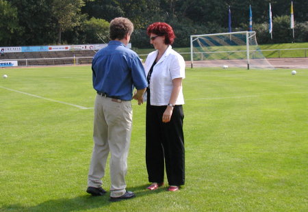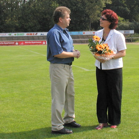 Wie wir auf unserer Seite "Aktuell" bereits hingewiesen haben, ist die Müritz-Sparkasse Sponsor unserer 2. Männermannschaft. Fau Melzer, als Vertreter der Warener Müritz-Sparkasse überreichte am 24.08.2002 offiziell die neue Spielkleidung. Fred Bethke, Vorsitzender des Vereins bedankt sich für die Unterstützung unserer Bezirksligamannschaft.