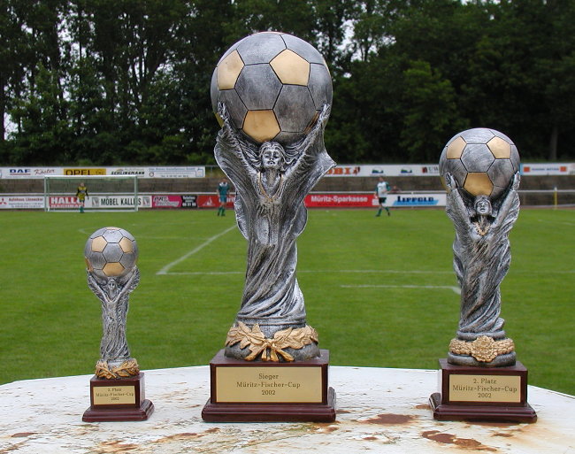(pb) Im Bild oben die von den Müritzfischern gestifteten Pokale anläßlich des Müritzfischercup 2002 . Sehr schöne Pokale, wie ich finde und die Anzahl der Mannschaften und das Niveau dieser Veranstaltung sind Ausdruck der Beliebtheit dieser sportlichen Veranstaltung im Müritzstadion in Waren. Gleichzeitig wurde an diesem 15.06.2002 der 5. Uwe-Neue-Cup für die Jugend bis zur Altersgruppe D ausgetragen. Für unentwegte WM-Fans war eine Möglichkeit geschaffen worden, sich über das Geschehen in Japan bzw. Korea zu informieren. Aber eigentlich waren die 20 Mannschaften zum Fußballspielen nach Waren gekommen. Der neu errichtete Kunstrasenplatz bietet für solche Großveranstaltungen völlig neue Dimensionen bei der Planung solcher Turniere. So ist diese Veranstaltung auch als eine sportlicher Attraktion der Stadt Waren zu betrachten. Das neben den vielen Freizeitmannschaften aber auch "echte Profis", wie die Tradionsmannschaft des BFC Dynamo Berlin, dem SV Titanic mit ehemaligen Hansaspielern und Spieler des FC Tollense Neubrandenburg teilnehmen, beweisen den Veranstaltern, dass dieser Cup über die regionalen Grenzen hinaus, bekannt und beliebt ist. Dazu die vielen Zuschauer und eine begeisternde Stimmung auf den vier Spielflächen. Als Höhepunkt das Spiel der Prominenten. Auch Petrus dachte an uns, dass die Spieler nach den Anstrengungen des Tages eine Erfrischung benötigen. War ja auch in Ordnung, nur leider zum falschen Zeitpunkt. Und so konnte die Technik nicht zur Dokumentation des Prominentenspiels eingesetzt werden. Die nachfolgende Tabelle gibt das Ergebnis in den Gruppen wieder.