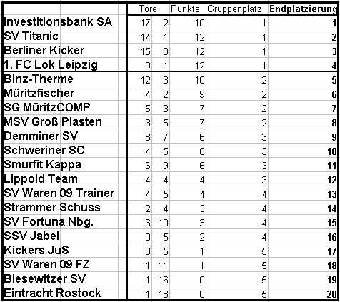 Auch in der Gruppe C konnte der SV Titanic seiner Favoritenrolle gerecht werden. Nur ein Gegentor gegen die SG MüritzCOMP (3:1) bei 14 eigenen Treffern reichte für den Halbfinalplatz. Der Vorjahres-Überraschungs-Halbfinalist Demminer SV kam in diesem Jahr über einen dritten Gruppenplatz nicht hinaus.