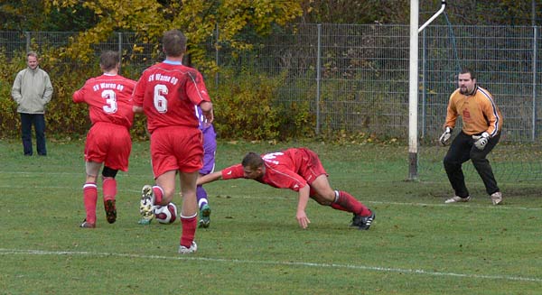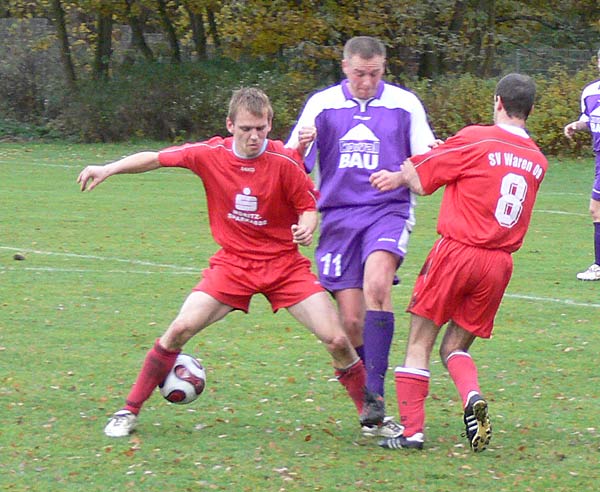 Von Beginn an zeigte 09 die richtige Einstellung und beherrschte weitestgehend das Spiel. Penzlin hatte kaum Gelegenheiten. Das 1:0 für Waren fiel, nachdem Ralf Salwiczek einen Einwurf von Robert Friske mit dem Kopf verlängerte und Hannes Bauer in den Ball sprang und per Kopf aus 5 Metern einnetzte(20.Minute). In der Folgezeit ließ der Gastgeber ein wenig nach, sodass Penzlin schon ausgleichen hätte müssen, doch freistehend schoss ein Stürmer am leeren Tor vorbei. 09 hatte aber auch gute Chancen. Ein guter Lupfer von Ralf Salwiczek verfehlte das Ziel knapp. Kopfbälle von Daniel Reichau oder Thomas Zühlcke fanden auch nicht den Weg ins Tor. Das 1:1 fiel, als ein Freistoß zu einem freistehenden Penzliner am langen Pfosten kam. Mehrere Verteidiger orientierten sich nur zu ihm, er passte in die Mitte, wo ein nicht mehr gedeckter Stürmer einfach nur einzuschieben brauchte(38.Minute). Dies war dann auch der Halbzeitstand.