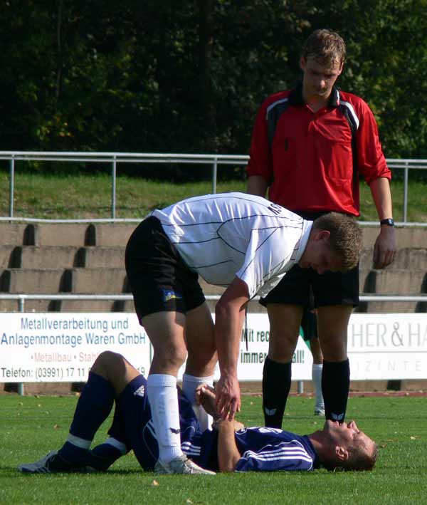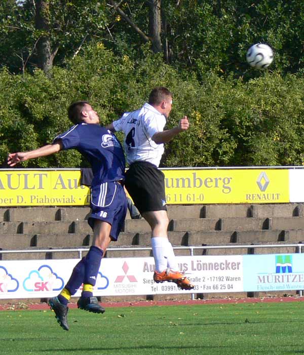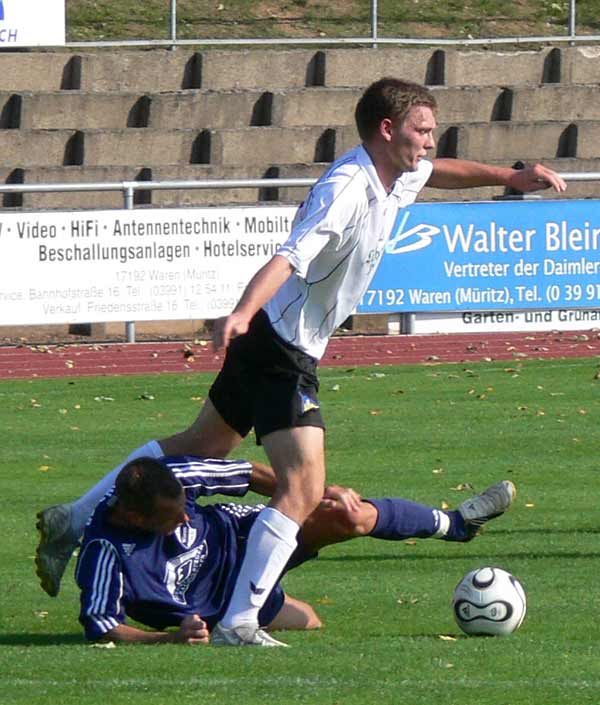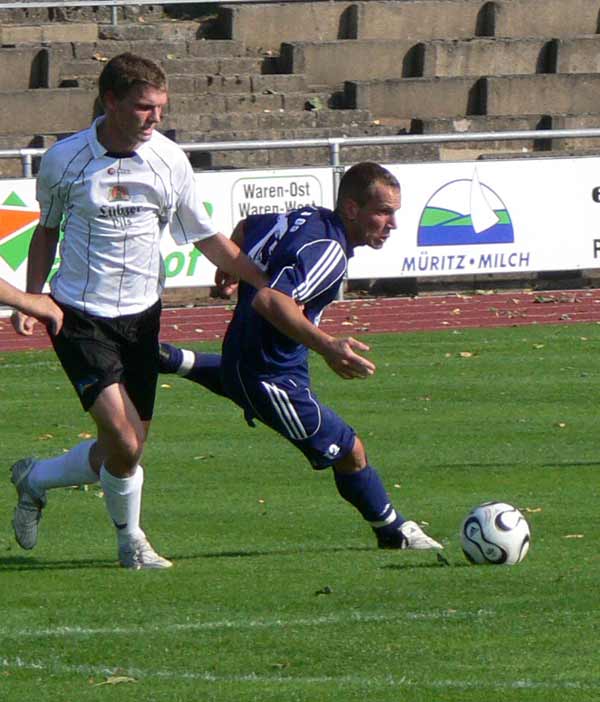 Der Notizzettel des Redakteurs war noch nie so leer, wie am heutigen Tage. Nur fünf Schüsse trafen das Tor bzw. dessen Umgrenzungstangen. Die Lübzer hatten dabei die besseren Aktionen. Nach einem Fehlpass aus der Abwehr wurde Gieseler auf halblinks geschickt. Sein Schuss landete am Außenpfosten (21.). Zehn Minuten später zog der Lübzer Angreifer nach einem Ballverlust der Warener im Mittelfeld erneut direkt aus 22 Metern ab. Der Ball senkte sich zum Siegtreffer unhaltbar für René Kreutz ins linke Dreieck des Tores. Kurz vor der Pause parierte der Warener Torwart einen Zehn-Meter-Schuss von Pingel glänzend. Das war es dann auch schon seitens der Gäste, sieht man mal von einem erfolgversprechenden Angriff in der zweiten Halbzeit ab, als ein Lübzer Angreifer zu eigensinnig einen Angriff abschloss.