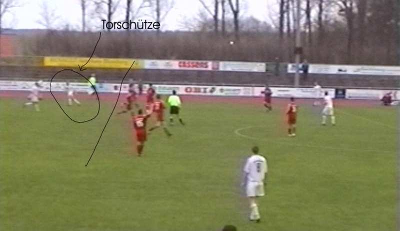 Kurz darauf zeigten die Gäste in einem der wenigen Konter ihre Gefährlichkeit. Mit zwei, drei Pässen stand ein Gästestürmer plötzlich allein vor dem Kasten von Stefan Metelmann. Glücklicherweise versagten dem Spieler die Nerven, er traf nur den Pfosten. Der Spielverlauf wäre auf den Kopf gestellt gewesen(57.). Vier Minuten später nutzte Guido Timper endlich einen gefälligen Angriffszug nach einer Flanke per Kopf zum hochverdienten Führungstreffer. Jetzt lösten die Gäste ihre konsequente Defensivhaltung und kamen besser ins Spiel. Nach einem Drehschuss von Guido Timper (69.) waren die gefährlichen Angriffszüge der Warener erstmal vorbei. Im Gegenteil, die Gäste nutzten nach einem Steilpass auf die linke Seite ihre zweite gute Chance im Spiel zum Ausgleichstreffer(78.). Der Linienrichter half dabei aber kräftig mit, denn der Torschütze (siehe Foto unten) stand weit im Abseits. Der Linienrichter ließ sich wahrscheinlich durch zwei zurücksprintende Gästestürmer irritieren. Jetzt nahm das Spiel richtig Fahrt auf. 09 wollte unbedingt den Sieg und spielte weiter nach vorn. Noch einmal verzog Jens Aepinus aus vielversprechender Position(83.). Dann wurde Jens für seinen nimmermüden Angriffsmut aber endlich belohnt. Nach einer Flanke von Guido Timper hechtete er am Elfmeterpunkt in den Ball und köpfte zum Siegtreffer in den Dreiangel. Tor des Monats!