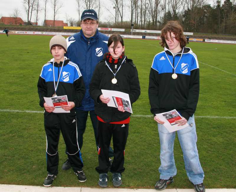 In der Halbzeit zeichnete der Verein die besten Nachwuchsspieler aus: Anna Iwanski (D-Juniorinnen), Mohammed Arabi (D-Junior), Florian Bartöck (C-Junioren) |