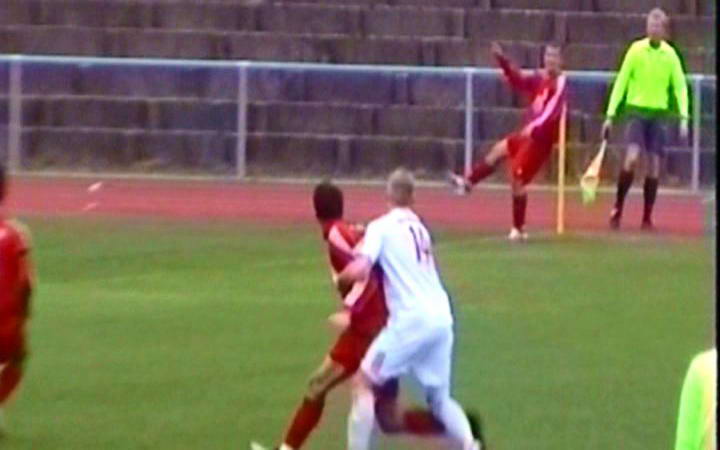 Wie erwartet standen die Weitenhägener bis zum Warener Führungstreffer tief in der eigenen Hälfte und versuchten ihr Gehäuse hermetisch abzuriegeln. Das gelang zwar nicht immer, aber der SV Waren 09 konnte aus den Fehlern der Rand-Greifswalder zunächst keinen Nutzen ziehen. Allein Jens Aepinus "versiebte" in den ersten zwanzig Minuten drei Hundertprozentige. Unbedrängt aus fünf Metern köpfte er über das Gebälk (5.), nach schönem Anspiel von Stefan Haase konnte er allein vor Hafermann stehend nicht vollenden(14.) und eben dieser Torwart kratzte den Aepinus-Freistoß aus dem Dreiangel (22.). Zwei Minuten später hatte der junge Warener Stürmer den nächsten Riesen. Wieder kein Erfolg. Dazwischen wurde Guido Timper (siehe Bild unten) im Strafraum folgenlos umgerissen (9.). Das so sehr ersehnte Tor gegen die Defensivkünstler fiel also nicht und im Laufe der ersten Halbzeit verflachte das Spiel dann zusehens.
