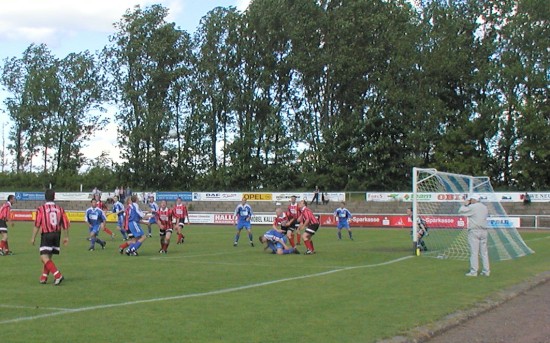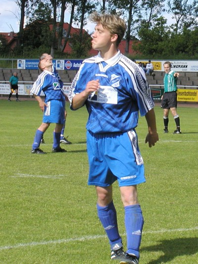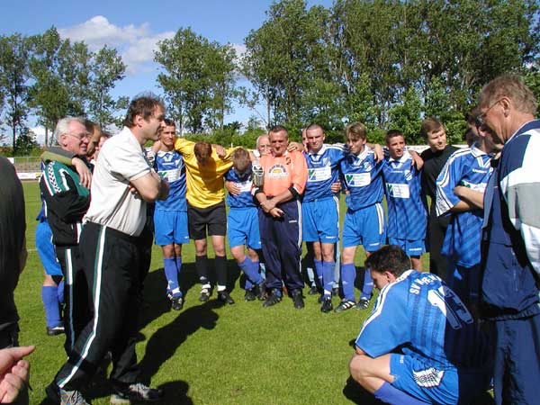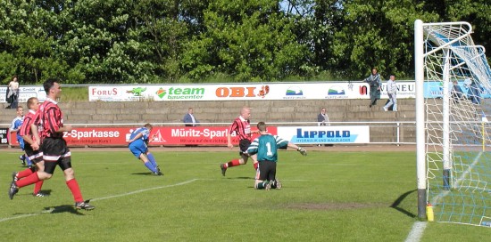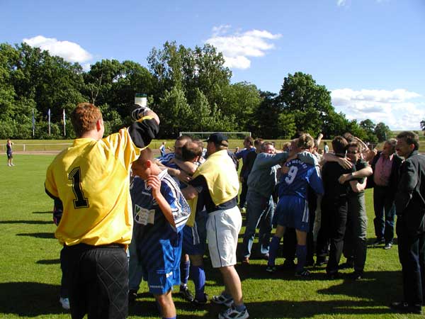 Zahlreiche Zuschauer waren erschienen, unter Ihnen der ehemalige Präsident des Vereins und Landrat Jürgen Seidel, der Bürgermeister der Stadt Waren Günter Rhein und Rudi Borchert MdL. Und diese Mannschaft hatte heute wirklich Verbandsliganiveau. Bereits in der 4. Minute konnte Nico Schwerin den Führungstreffer erzielen. Dieses Führungstor schien Flügel verliehen zu haben wie es zu einem bekannten Energy-Drink heißt. Das Spiel fand nun überwiegend in der Hälfte des Gegners statt. Nachdem Skibinski in der 22. Minute und dann in der 28. Minute Waren auf 3:0 schoß, war die Moral des Gegners am Boden. Auch nach der Halbzeit konnte Torwart Andreas Haase mehr oder weniger die schöne Sonne genießen und hatte sogar Zeit für ein Foto. Tomasz Skibinski konnte mit seinem dritten Treffer in der 87. Minute das 4:0 für Waren erzielen. Nach dem pünktlichen Abpfiff der erste noch gedämpfte Jubelschrei von Warener Seite. Noch war der Ausgang in Anklam nicht klar. Der Vorsitzende des Vereins, Fred Bethke mit dem Telefon am Ohr wartete und es dauerte noch 5 Minuten. Nun war es klar, Anklam hatte gegen Pasewalk mit 3:2 gewonnen. Damit war der so lange erhoffte Aufstieg in die Verbandsliga von Mecklenburg/Vorpommern erreicht. Eine schöne Feier mit vielen Auszeichnungen, Essen vom Grill und Freibier war krönender Abschluß dieses 1. Juni 2002. |