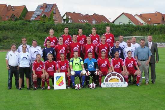 Mitte: Bernd Klein (Fußballobmann), Jörg Hickl, Kathrin Lompa (Physiotherapeuten) Dr. Dieter Hotzelmann (Mannschaftsarzt) Patrick Romanik, Jan Aepinus, Guido Timper, Stefan Haase, Tim Koßek, Daniel Reichau, Thomas Vierow (Co-Trainer), André Schröder (Trainer), Dietmar Boehlke (Co-Trainer), Fred Bethke (1. Vorsitzender), Günther Neumann (Geschäftsführer Mecklenburger Backstuben)