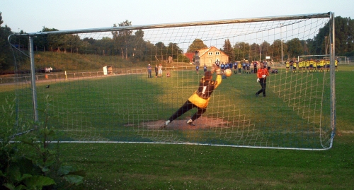 Die C-Junioren des SV Waren 09 erreichten das Pokalfinale in Altentreptow des Bezirkes Ost über Siege gegen NEVAG NB , TSV Friedland und GW Ferdinandshof. Am 18.06.2003 lautete das Finalspiel SV Waren 09 – Rot-Weiß Wolgast. Wolgast war in diesem Spiel der Favorit, resultierend aus den Punktspielen (1:2 , 1:6). Aber Pokalspiele haben ihre eigenen Gesetze. Dementsprechend wurde die Mannschaft durch die Trainer Disteler und Ungewitter eingestellt . Stammtorwart Stoll musste verletzungsbedingt ersetzt werden. Im Tor der C-Junioren wie bereits im vergangenen Punktspiel gegen Torgelow (6:1) Torsten Seidel, der eine fehlerfreie Leistung ablieferte. In den ersten 50 Minuten konnten die Warener den Wolgastern ihre Spielweise aufzwingen und hatte auch die besseren Chancen durch Reichau, Meyne, Schwager und Görtz. Unglücklich agierte der Schiedsrichter, der im gesamten Spiel keinen sicheren Eindruck hinterließ und in der 1. Halbzeit ein deutliches Übergewicht an Entscheidungen für die Wolgaster fällte. Waren 09 wurde nach einer unglücklichen Aktion vom unermüdlich rackernden Toni Schwager, der in der 15.min mit einem doppelten Armbruch das Spielfeld verlassen musste und in das Klinikum Neubrandenburg gebracht wurde, geschwächt. In der Nacht wurde er noch operiert und wird für 10 Tage dort bleiben müssen. Die Mannschaft und der Verein wünschen ihm alles Gute. Nach dem Halbzeitstand von 0:0 konnte Waren 09 nach einem Freistoß von Meyne, den er auf den langen Pfosten der Wolgaster zog, in der 48.min durch Görtz, der diesen Ball per Kopfball im Tor der Wolgaster unterbrachte, in Führung gehen. Wolgast raffte sich danach auf und konnte durch die größere Physis nach Abwehrschnitzern der Warener in der 55. min und in der 62. min. mit 2:1 in Führung gehen. Aber auch diese Führung der Wolgaster konnte die Moral der Warener C-Junioren nicht erschüttern. Unter den Augen vom Vereinspräsidenten Fred Bethke kämpfte die Mannschaft, jeder auf seiner Position für den Ausgleich, den der sichtlich angeschlagene Martin Evert zwei Minuten vor Ultimo nach Pass von M. Meyne im Solo überlegt erzielen konnte. Mit dem Stand von 2:2 ging es in die Verlängerung von 10 min, in der es eine Torchance für Wolgast gab, die Torsten Seidel im Tor jedoch großartig parierte. So kam es zum Elfmeterschießen: