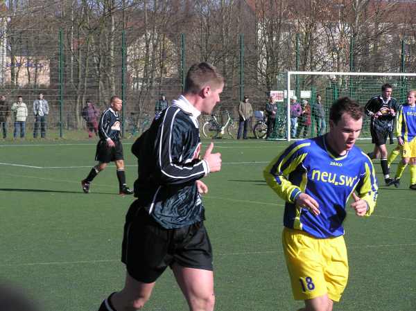 Nach der Pause drängten die Warener jetzt mit aller Macht auf den Anschlusstreffer, der nach einer Ecke von René Drabner und Kopfballverlängerung von Thomas Duggert durch Toralf Schult, der den Ball über die Linie drückte, auch ziemlich früh fiel. Die Neubrandenburger schienen sich in der ersten Halbzeit übernommen zu haben. Teilweise stehend k.o. wurden die Neubrandenburger in ihre Hälfte gedrängt. Nur Einem gefiel dieses Spiel. Marion Kusturin bedankte sich nach einem katastrophalen Fehlpass von Thomas Duggert aus der eigenen Abwehr nach einem Steilpass aus abseitsverdächtiger Position mit dem 3:1. Diesmal ließ er Thomas Vierow keine Chance. In der nächsten Situation sah Krüger gelb/rot. Die Müritzstädter und vor allem Thomas Duggert, der auf Wiedergutmachung drängte, waren jetzt im unaufhörlichen Vorwärtsdrang. Eine Viertelstunde vor Schluss wurde Thomas Duggert mit dem 3:2 Anschlusstreffer belohnt als er nach einem Gewühl im Strafraum den Ball bekam, Sandro Thomas im Neubrandenburger Tor umkurvte und den Ball über die Linie buchsierte. Jetzt hatten die Warener Chancen im Minutentakt und die Neubrandenburger Bank gerat total in Panik. Vor allem Guido Timper boten sich Chancen per Kopf und Fuß zum Ausgleich. Dieser gelang leider nicht. Im Gegenteil, der putzmuntere Kusturin zog jetzt auf rechts auf und davon, seinen Schuss klatschte Thomas Vierow genau vor die Füße von Stefan Westphal, der seelenruhig zum 4:2 einschob. Die Warener ließen sich aber immer noch nicht hängen. Im Gegenzug wurde der eingewechselte Thomas Zühlke im gegnerischen Strafraum von den Beinen geholt. Den fälligen Strafstoß verwandelte Thomas Duggert souverän. Powerplay auf das Neubrandenburger Tor war jetzt angesagt. Die Neubrandenburger wankten, fielen aber nicht, weil den Warenern Aktionen im Strafraum die nötige Präzision und vielleicht auch das Quentchen Glück fehlte. Das hatte dann in der letzten Aktion des Spiels erneut Mario Kusturin, der nach einem Konter den Ball, erneut nach Abseits riechend, in die Maschen schob.