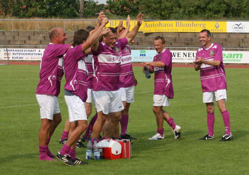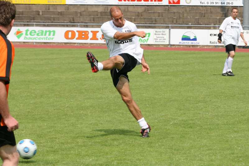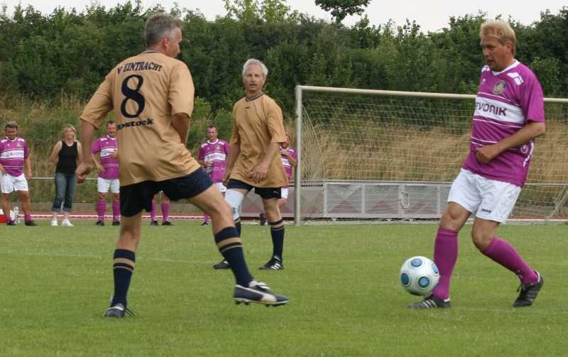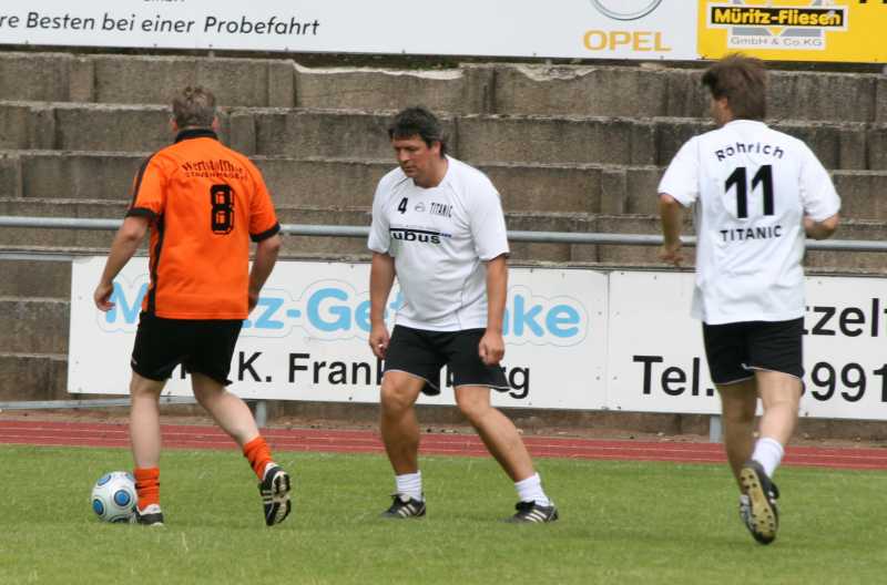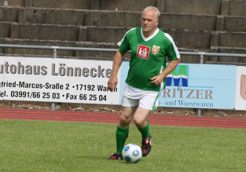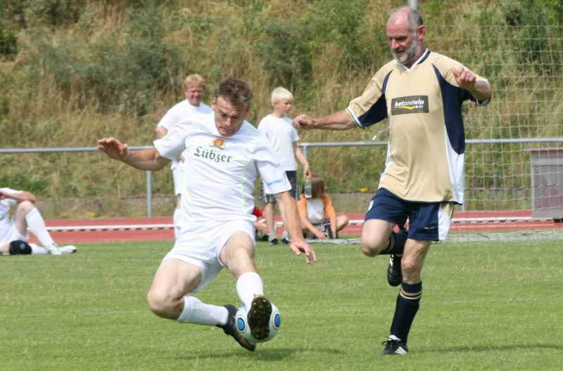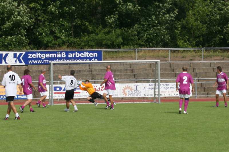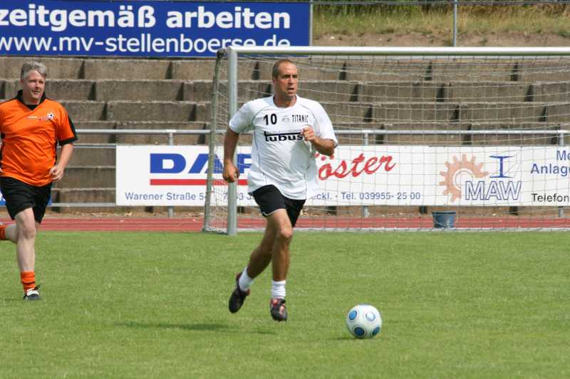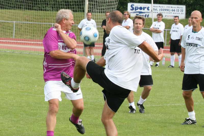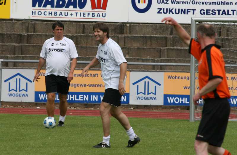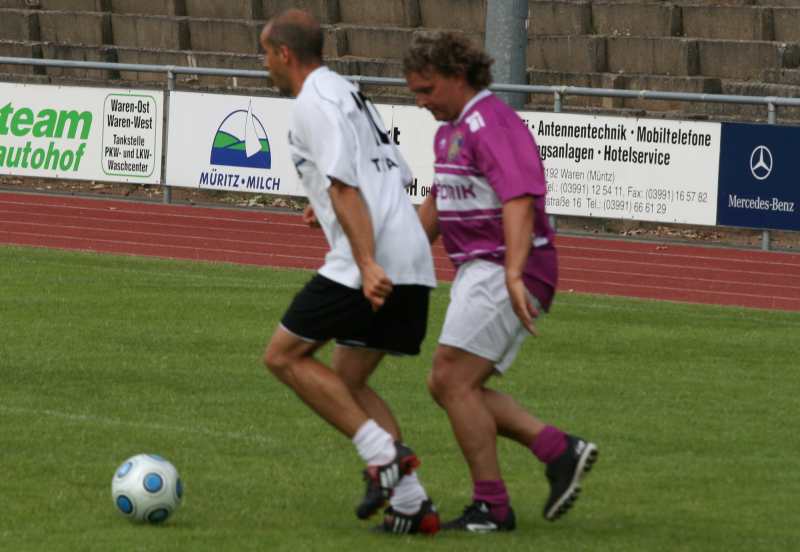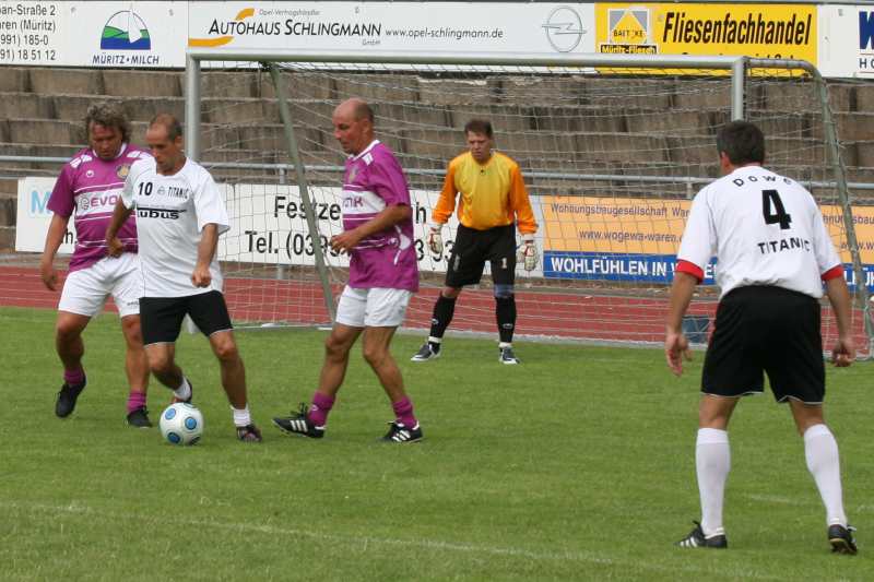Und was im MüritzCOMP-Cup-Finale auf den Platz lief, da konnte der Fußballfan nur mit der Zunge schnalzen. Lok hatte in diesem Jahr den ehemaligen Torschützenkönig der DDR-Oberliga Dieter Kühn, der am Turniertag seinen 53. Geburtstag feierte, mitgebracht. Immer wieder angetrieben von den filigranen Fußballern Frank Baum und Uwe Ferl, unterstützt vom trickreichen Heiko Scholz wollte man dem deutlich jüngeren Widerpart Paroli bieten, der auf dem glänzend präparierten Rasen des Müritzstadions mit klangvollen Namen auflief: Paule Beinlich, Hilmar Weilandt und Jens Dowe zeigten mehrfach Proben ihres überragenden Könnens. Unterstützt wurden sie von Volker Röhrich, Bernd Arnold, Maik Bullerjahn, Gernot Alms und Frank Rillich. Diese Aufstellung hätte vor noch garnicht so langer Zeit das Ostseestadion ziemlich gefüllt.
