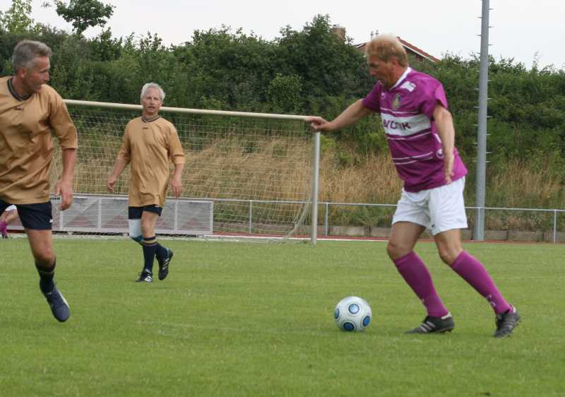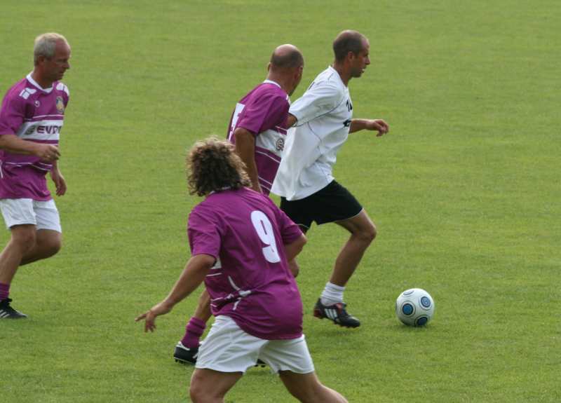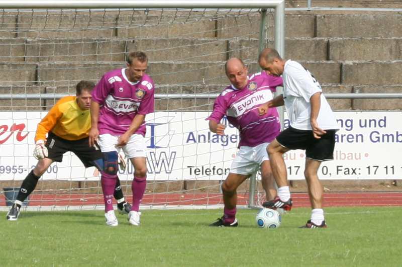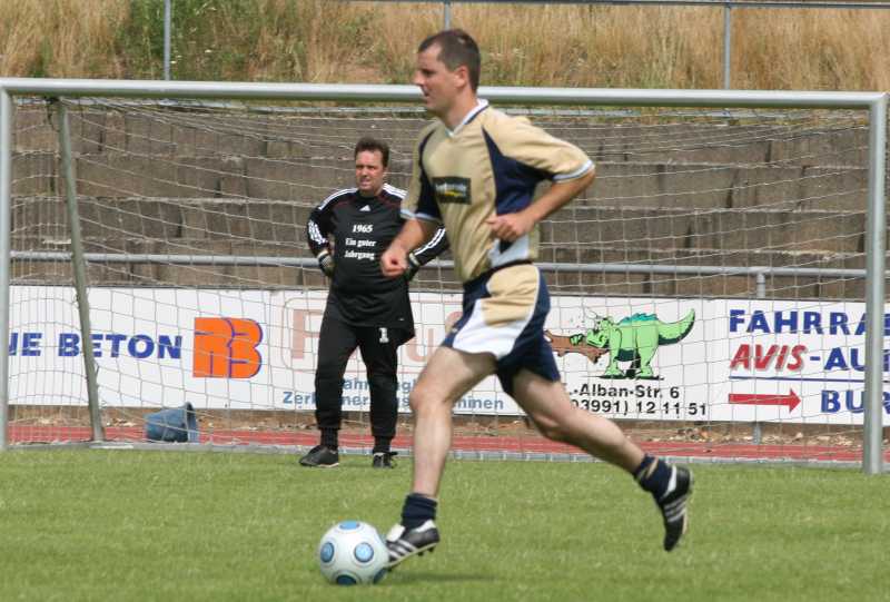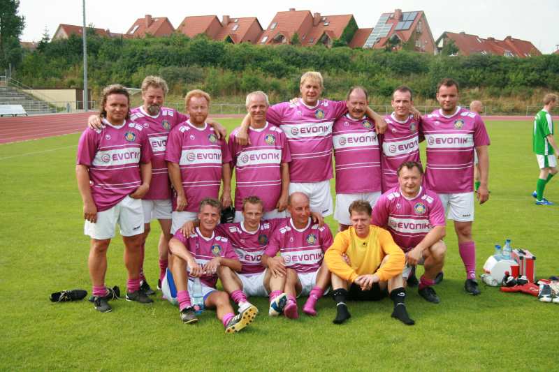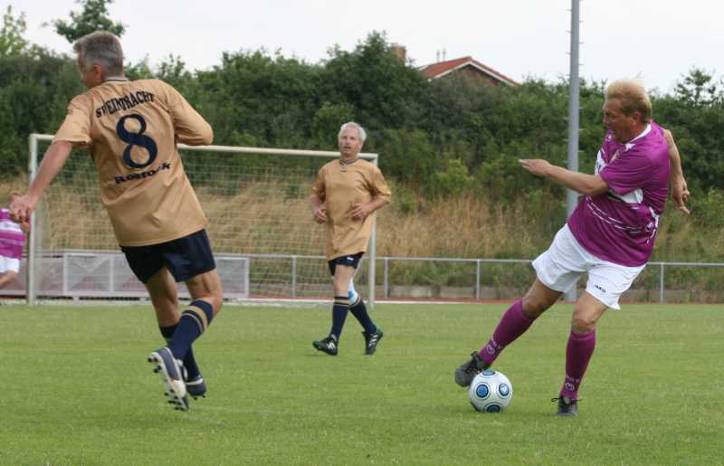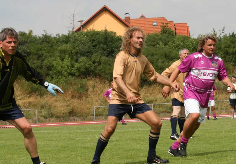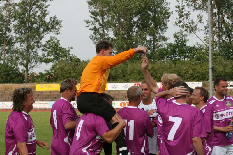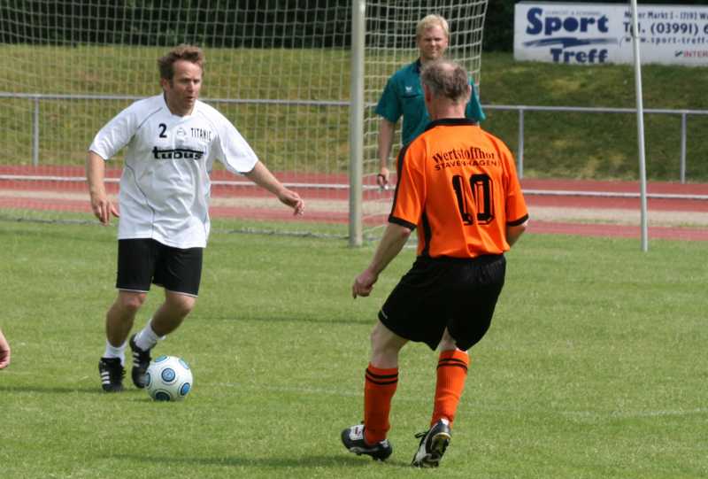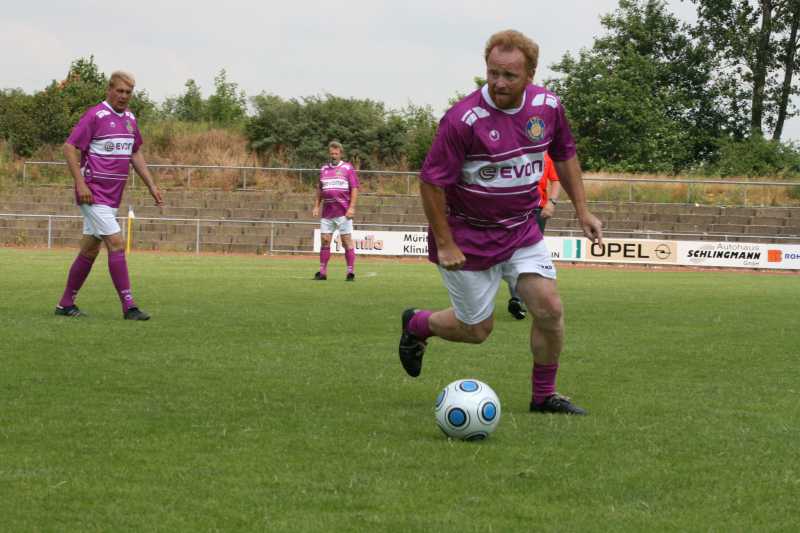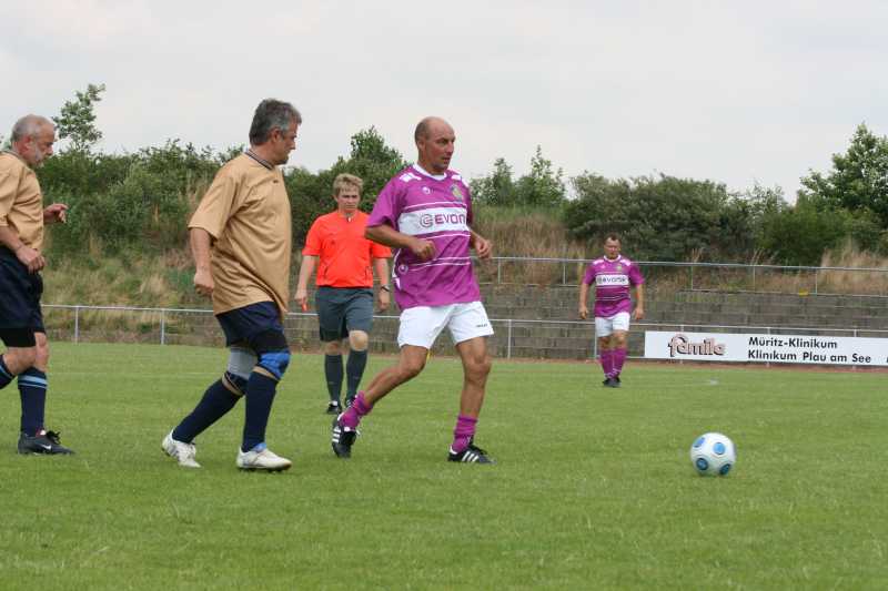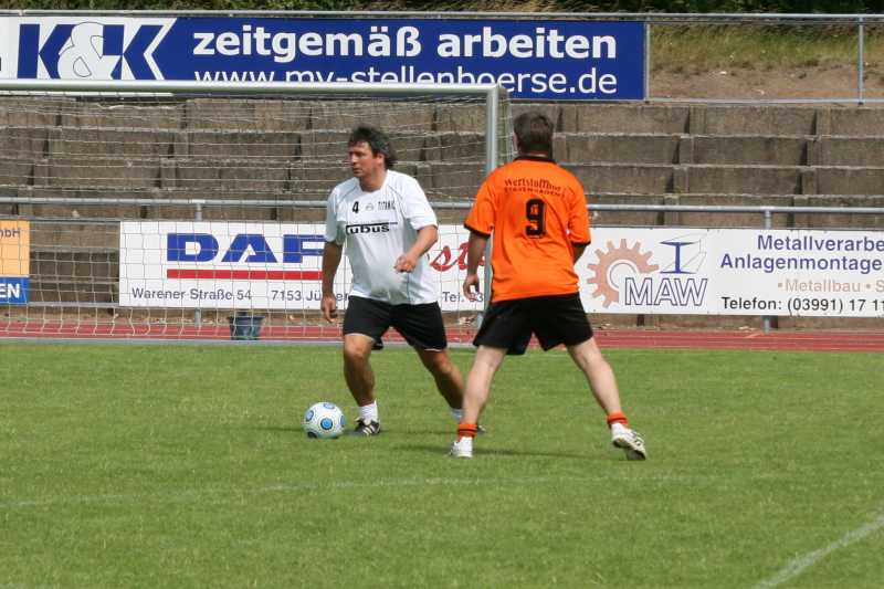 Und was im MüritzCOMP-Cup-Finale auf den Platz lief, da konnte der Fußballfan nur mit der Zunge schnalzen. Lok hatte in diesem Jahr den ehemaligen Torschützenkönig der DDR-Oberliga Dieter Kühn, der am Turniertag seinen 53. Geburtstag feierte, mitgebracht. Immer wieder angetrieben von den filigranen Fußballern Frank Baum und Uwe Ferl, unterstützt vom trickreichen Heiko Scholz wollte man dem deutlich jüngeren Widerpart Paroli bieten, der auf dem glänzend präparierten Rasen des Müritzstadions mit klangvollen Namen auflief: Paule Beinlich, Hilmar Weilandt und Jens Dowe zeigten mehrfach Proben ihres überragenden Könnens. Unterstützt wurden sie von Volker Röhrich, Bernd Arnold, Maik Bullerjahn, Gernot Alms und Frank Rillich. Diese Aufstellung hätte vor noch garnicht so langer Zeit das Ostseestadion ziemlich gefüllt.
