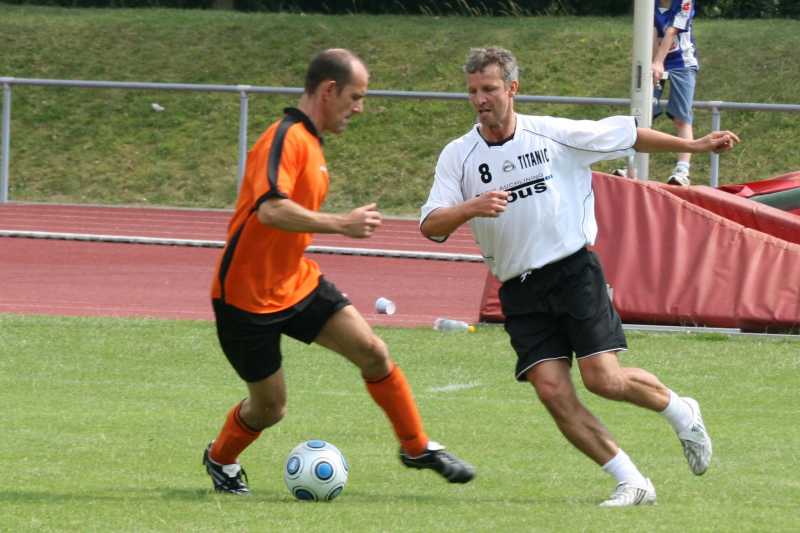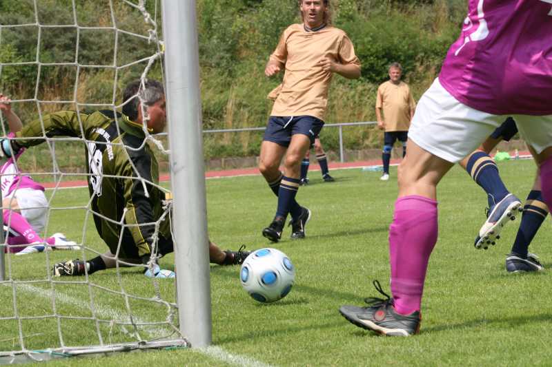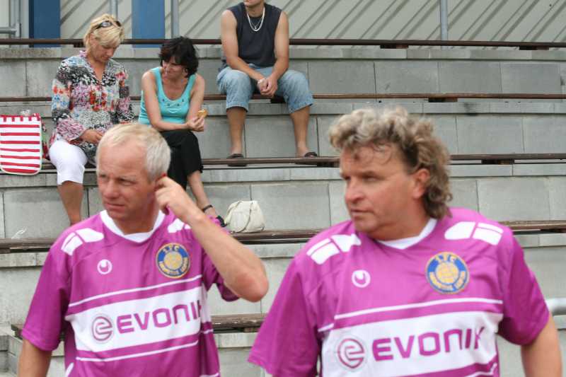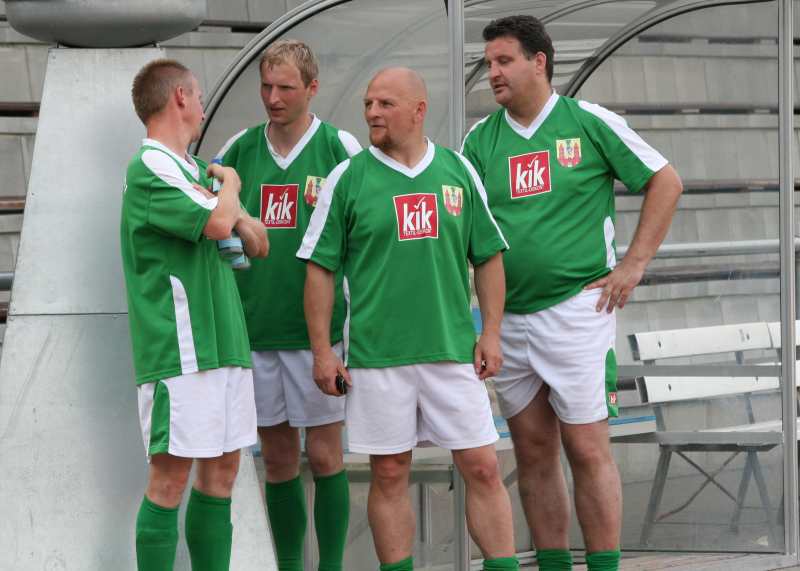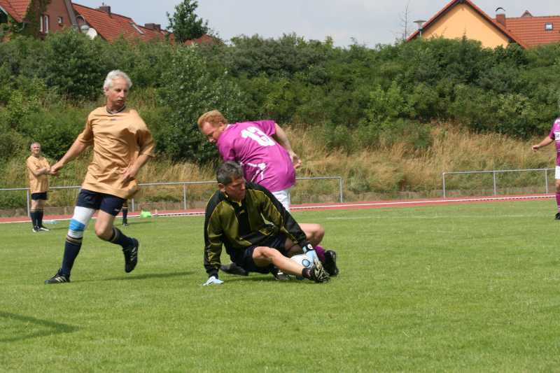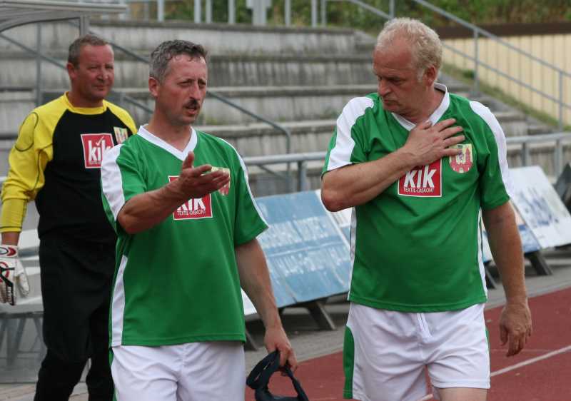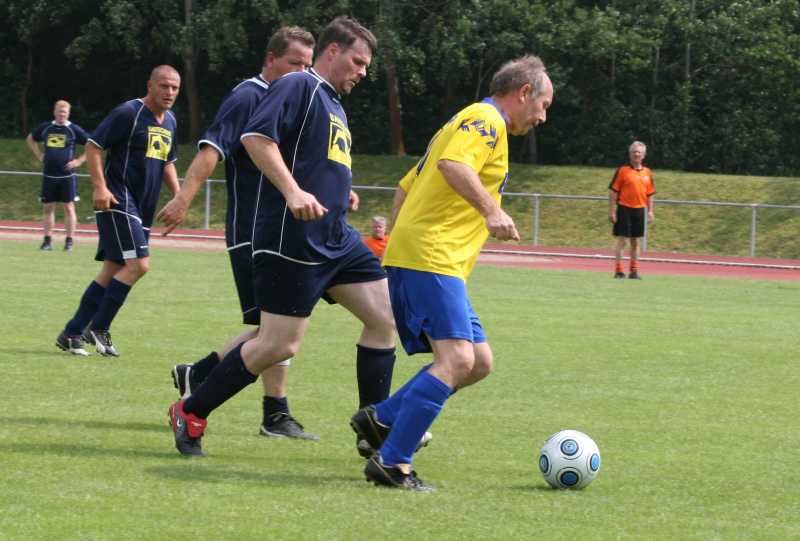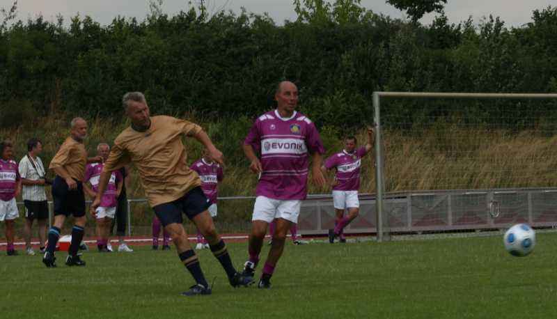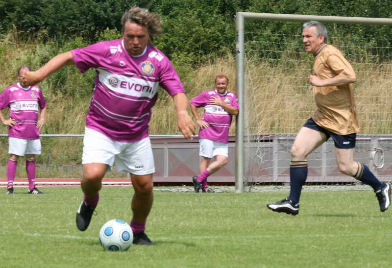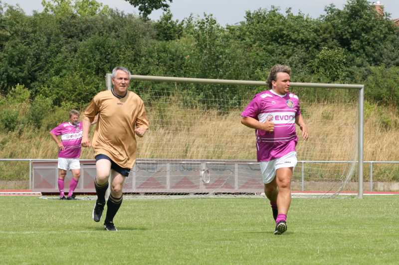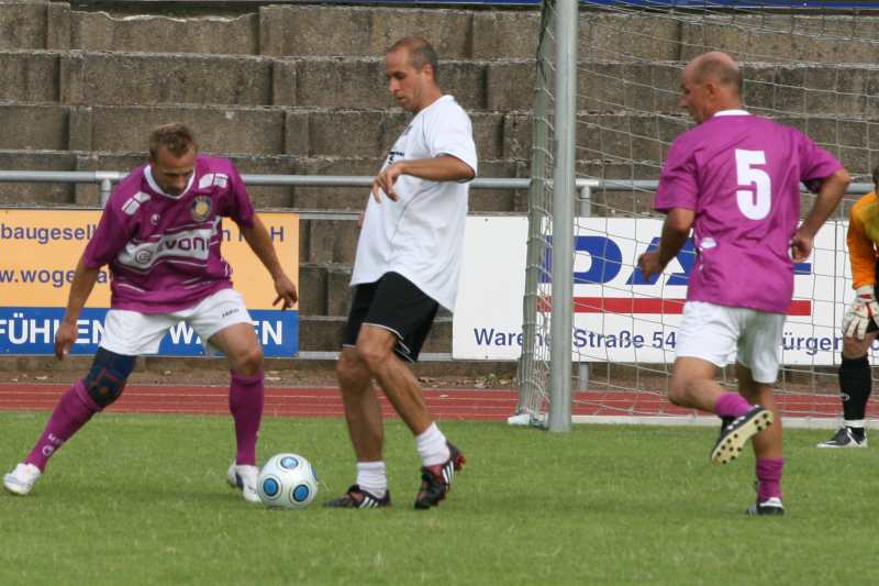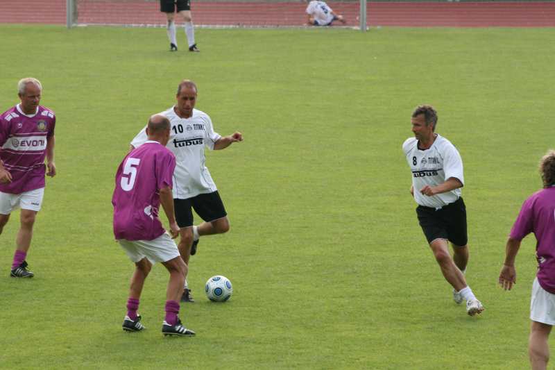 Und was im MüritzCOMP-Cup-Finale auf den Platz lief, da konnte der Fußballfan nur mit der Zunge schnalzen. Lok hatte in diesem Jahr den ehemaligen Torschützenkönig der DDR-Oberliga Dieter Kühn, der am Turniertag seinen 53. Geburtstag feierte, mitgebracht. Immer wieder angetrieben von den filigranen Fußballern Frank Baum und Uwe Ferl, unterstützt vom trickreichen Heiko Scholz wollte man dem deutlich jüngeren Widerpart Paroli bieten, der auf dem glänzend präparierten Rasen des Müritzstadions mit klangvollen Namen auflief: Paule Beinlich, Hilmar Weilandt und Jens Dowe zeigten mehrfach Proben ihres überragenden Könnens. Unterstützt wurden sie von Volker Röhrich, Bernd Arnold, Maik Bullerjahn, Gernot Alms und Frank Rillich. Diese Aufstellung hätte vor noch garnicht so langer Zeit das Ostseestadion ziemlich gefüllt.