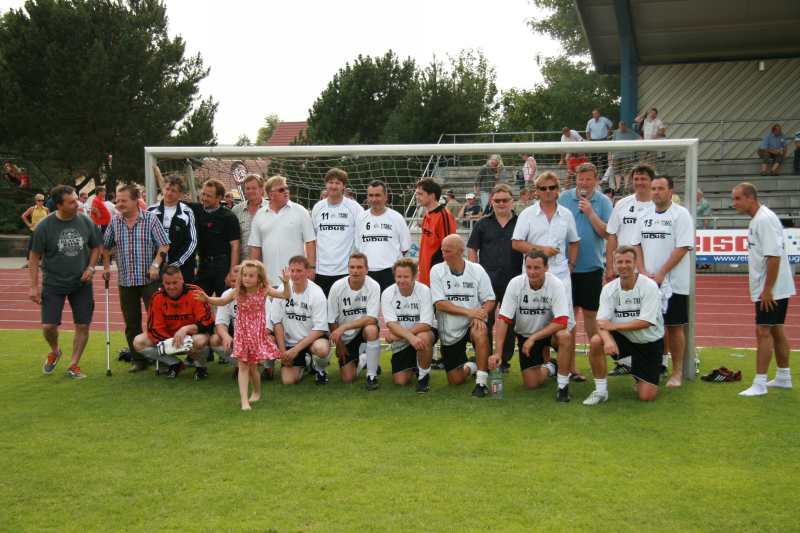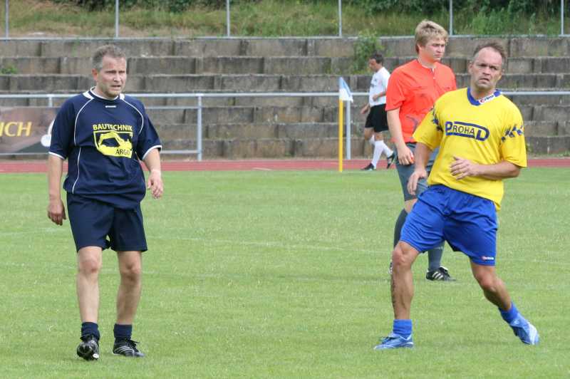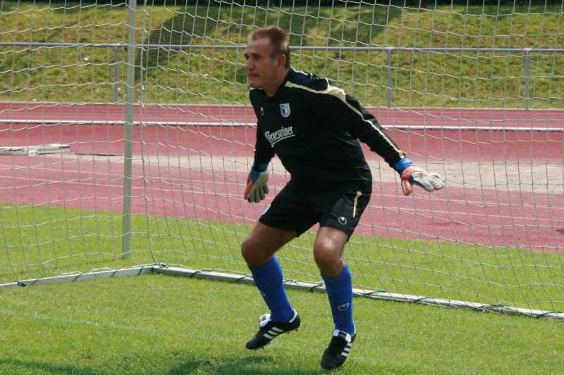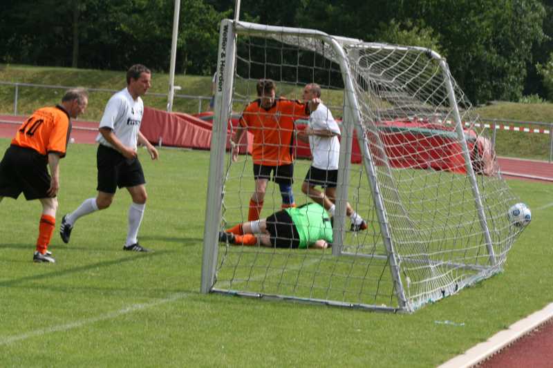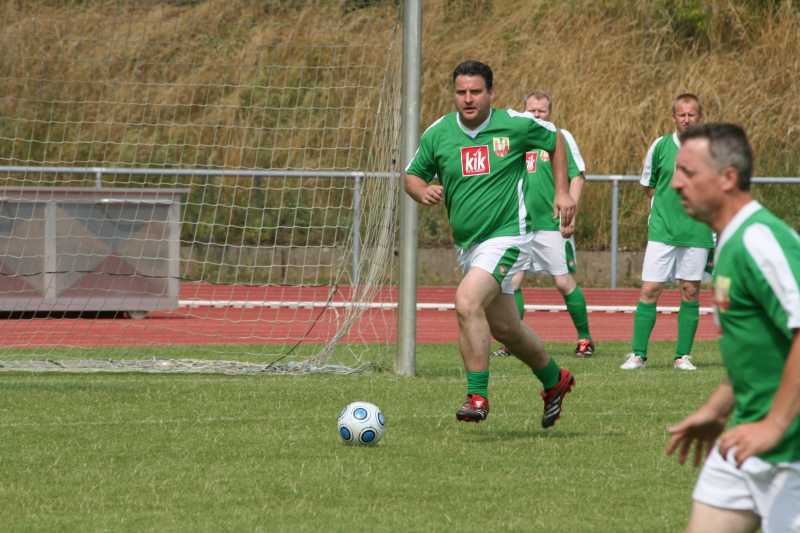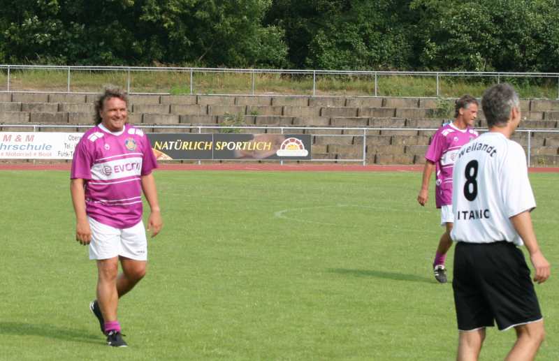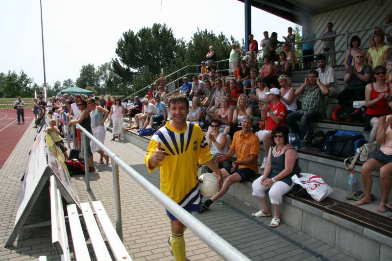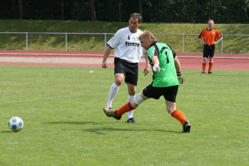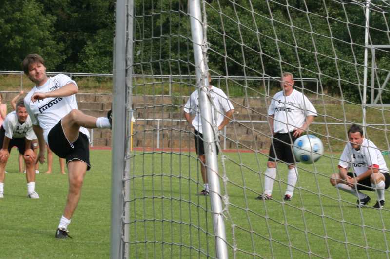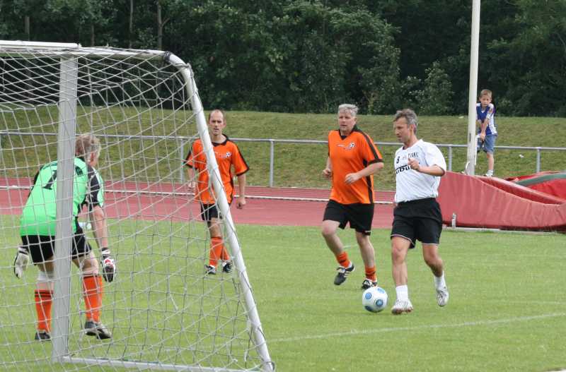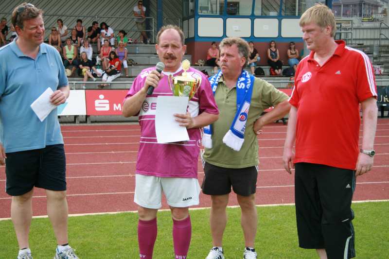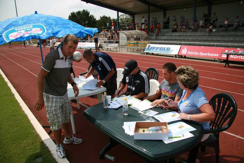Und was im MüritzCOMP-Cup-Finale auf den Platz lief, da konnte der Fußballfan nur mit der Zunge schnalzen. Lok hatte in diesem Jahr den ehemaligen Torschützenkönig der DDR-Oberliga Dieter Kühn, der am Turniertag seinen 53. Geburtstag feierte, mitgebracht. Immer wieder angetrieben von den filigranen Fußballern Frank Baum und Uwe Ferl, unterstützt vom trickreichen Heiko Scholz wollte man dem deutlich jüngeren Widerpart Paroli bieten, der auf dem glänzend präparierten Rasen des Müritzstadions mit klangvollen Namen auflief: Paule Beinlich, Hilmar Weilandt und Jens Dowe zeigten mehrfach Proben ihres überragenden Könnens. Unterstützt wurden sie von Volker Röhrich, Bernd Arnold, Maik Bullerjahn, Gernot Alms und Frank Rillich. Diese Aufstellung hätte vor noch garnicht so langer Zeit das Ostseestadion ziemlich gefüllt.